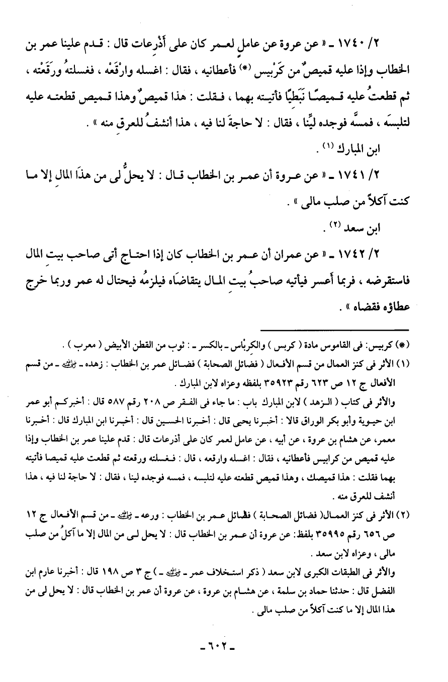 2/ 1741 - "عن عروة أن عمر بن الخطاب قال: لا يحلُّ لى من هذَا المالِ إلا ما كنت آكلًا من صلب مالى".
