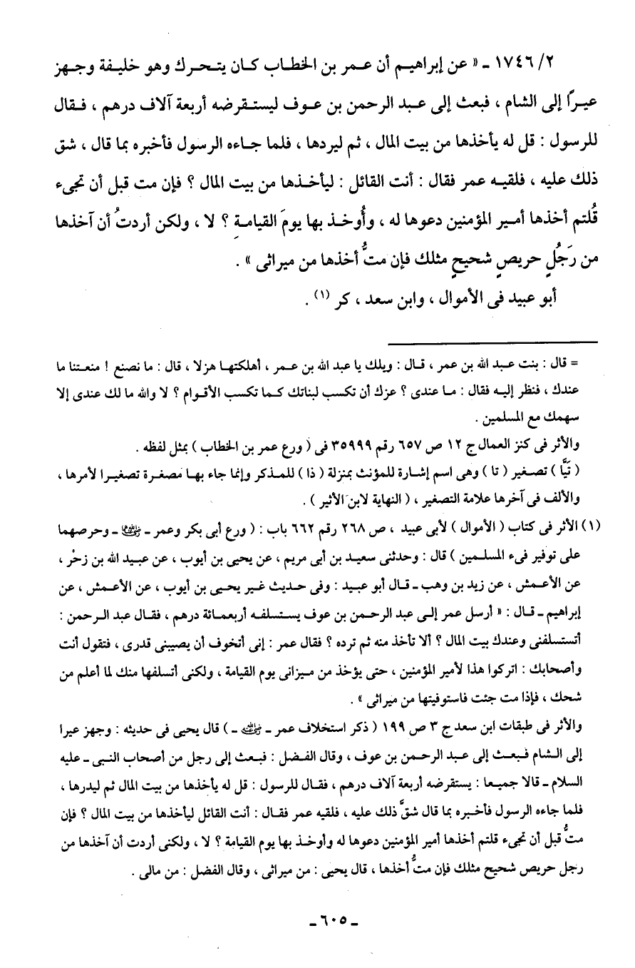 2/ 1746 - "عن إبراهيم أن عمر بن الخطاب كان يتحرك وهو خليفة وجهز عيرًا إلى الشام، فبعث إلى عبد الرحمن بن عوف ليستقرضه أربعة آلاف درهم، فقال للرسول: قل له يأخذها من بيت المال، ثم ليردها، فلما جاءه الرسول فأخبره بما قال، شق ذلك عليه، فلقيه عمر فقال: أنت القائل: ليأخذها من بيت المال؟ فإن مت قبل أن تجئ قُلتم أخذها أمير المؤمنين دعوها له، وأُوخذ بها يومَ القيامةِ؟ لا, ولكن أردتُ أن آخذها من رَجُلٍ حريصٍ شحيحٍ مثلك فإن متُّ أخذها من ميراثى".