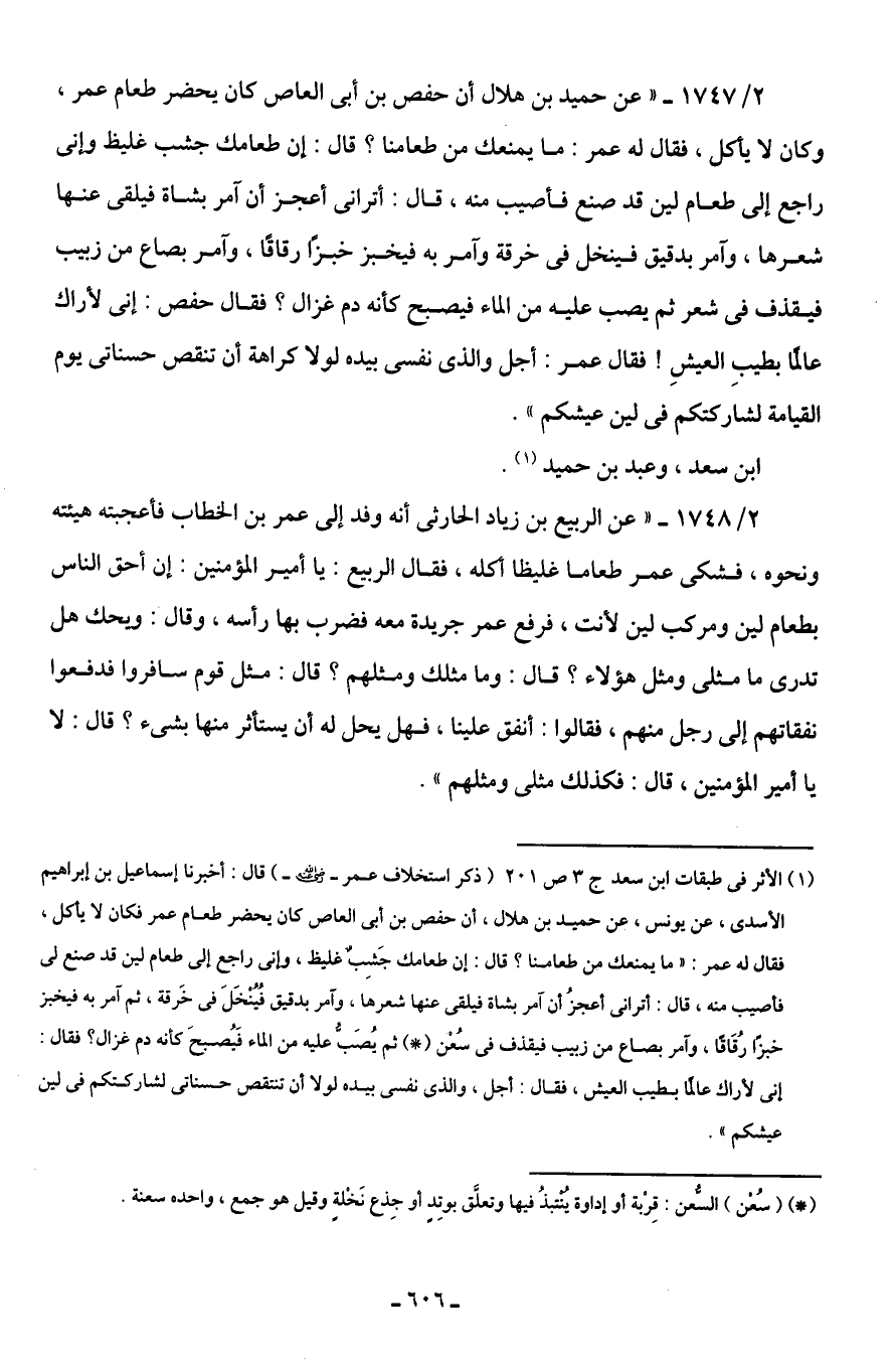 (¬1) الأثر في طبقات ابن سعد جـ 3 ص 201 (ذكر استخلاف عمر -رضي اللَّه عنه-) قال: أخبرنا إسماعيل بن إبراهيم الأسدى، عن يونس، عن حميد بن هلال، أن حفص بن أَبى العاص كان يحضر طعام عمر فكان لا يأكل، فقال له عمر: "ما يمنعك من طعامنا؟ قال: إن طعامك جَشِبٌ غليظ، وإنى راجع إلى طعام لين قد صنع لى فأصيب منه، قال: أترانى أعجزُ أن آمر بشاة فيلقى عنها شعرها، وآمر بدقيق فُيُنْخَلَ في خَرقة، ثم آمر به فيخبز خبزًا رُقَاقًا، وآمر بصاع من زبيب فيقذف في سُعْن (*) ثم يُصَبُّ عليه من الماء فَيُصبحَ كأنه دم غزال؟ فقال: إنى لأراك عالمًا بطيب العيش، فقال: أجل، والذى نفسى بيده لولا أن تنتقص حسناتى لشاركتكم في لين عيشكم".