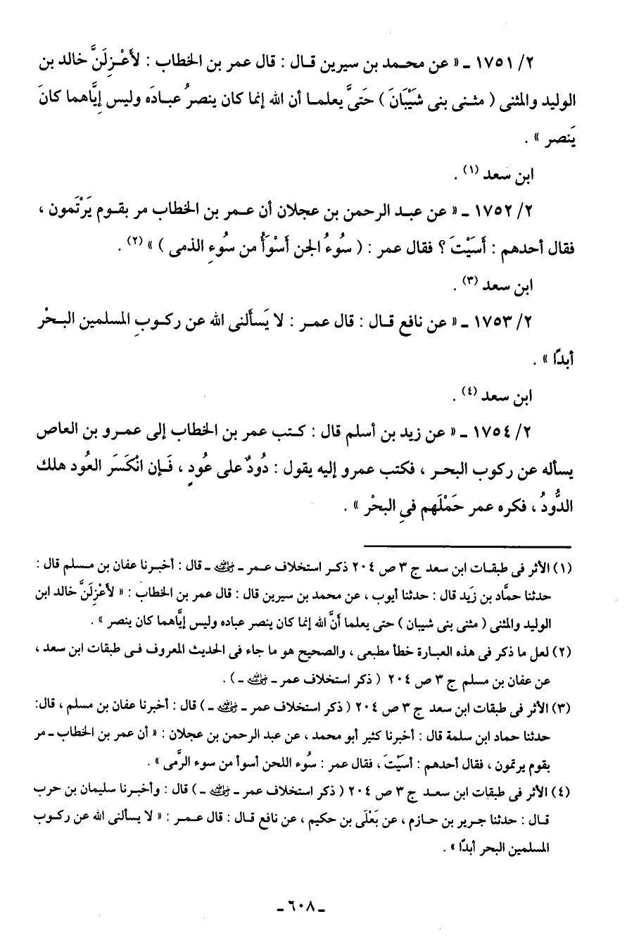 2/ 1753 - "عن نافع قال: قال عمر: لا يَسأَلنى اللَّه عن ركوبِ المسلمين البحْر أبدًا".