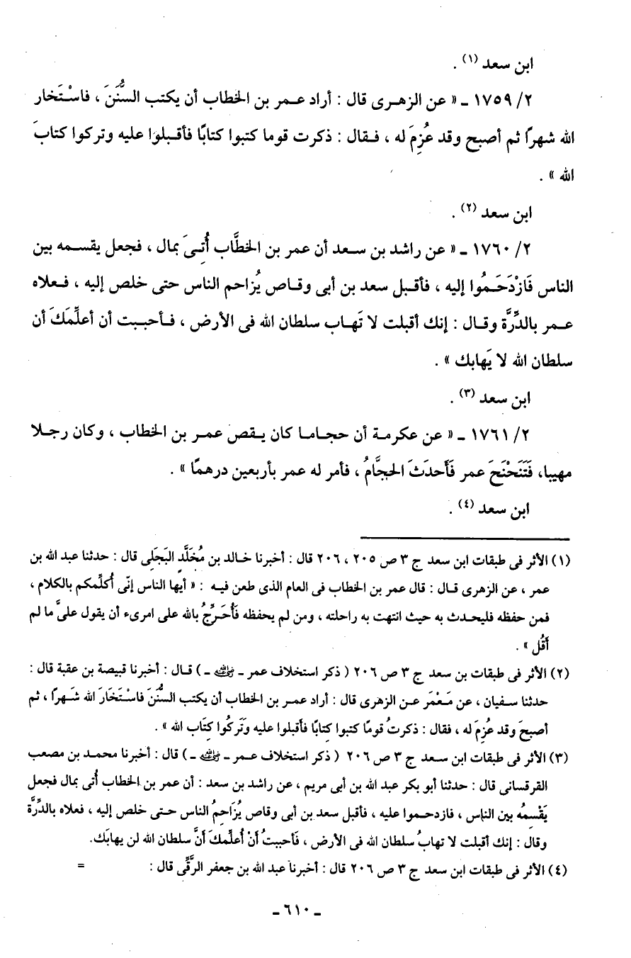 (¬2) الأثر في طبقات بن سعد جـ 3 ص 206 (ذكر استخلاف عمر -رضي اللَّه عنه-) قال: أخبرنا قبيصة بن عقبة قال: حدثنا سفيان، عن مَعْمَر عن الزهرى قال: أراد عمر بن الخطاب أن يكتب السُّننَ فاسْتَخَارَ اللَّه شَهرًا، ثم أصبحَ وقد عُزِمَ له، فقال: ذكرتُ قومًا كتبوا كِتابًا فأَقبلوا عليه وَتَركُوا كِتَاب اللَّه".