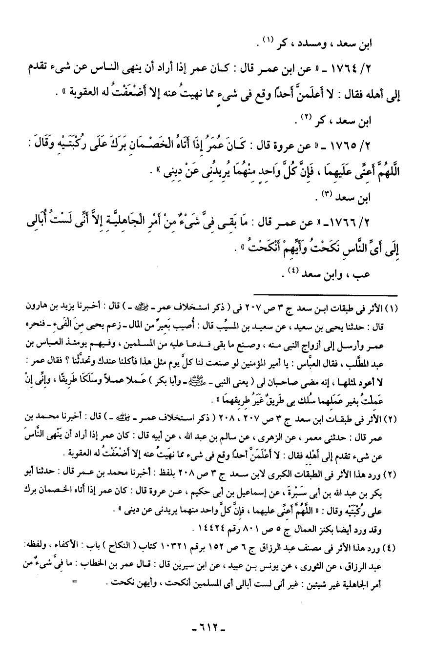 (¬2) الأَثر في طبقات ابن سعد جـ 3 ص 207، 208 (ذكر استخلاف عمر -رضي اللَّه عنه-) قال: أخبرنا محمد بن عمر قال: حدثنى معمر، عن الزهرى، عن سالم بن عبد اللَّه، عن أبيه قال: كان عمر إذا أراد أن يَنْهى النَّاسَ عن شئ تقدم إلى أَهْلِهِ فقال: لا أَعْلَمَنَّ أحدًا وقع في شئ مما نهَيتُ عنه إلا أَضْعَفتُ له العقوبة.