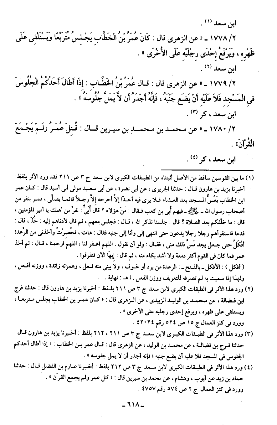 2/ 1778 - "عن الزهرى قال: كَانَ عُمَرُ بْنُ الْخَطَّابِ يَجْلِسُ مُتَرَبِّعًا وَيَسْتَلقِى عَلَى ظَهْرِهِ، وَيَرْفَعُ إِحْدَى رِجْلَيْهِ عَلَى الأُخْرَى".