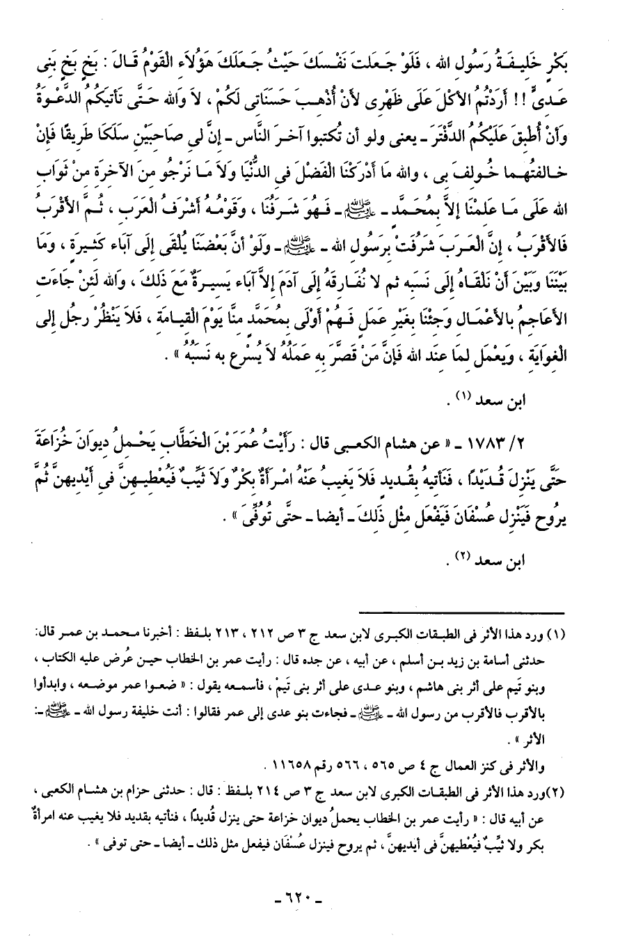 (¬1) ورد هذا الأثر في الطبقات الكبرى لابن سعد جـ 3 ص 212، 213 بلفظ: أخبرنا محمد بن عمر قال: حدثنى أسامة بن زيد بن أسلم، عن أبيه، عن جده قال: رأيت عمر بن الخطاب حين عُرض عليه الكتاب، وبنو تَيم على أثر بنى هاشم، وبنو عدى على أثر بنى تَيمْ، فأسمعه يقول: "ضعوا عمر موضعه، وابدأوا بالأقرب فالأقرب من رسول اللَّه -صلى اللَّه عليه وسلم- فجاءت بنو عدى إلى عمر فقالوا: أنت خليفة رسول اللَّه -صلى اللَّه عليه وسلم-: الأثر".