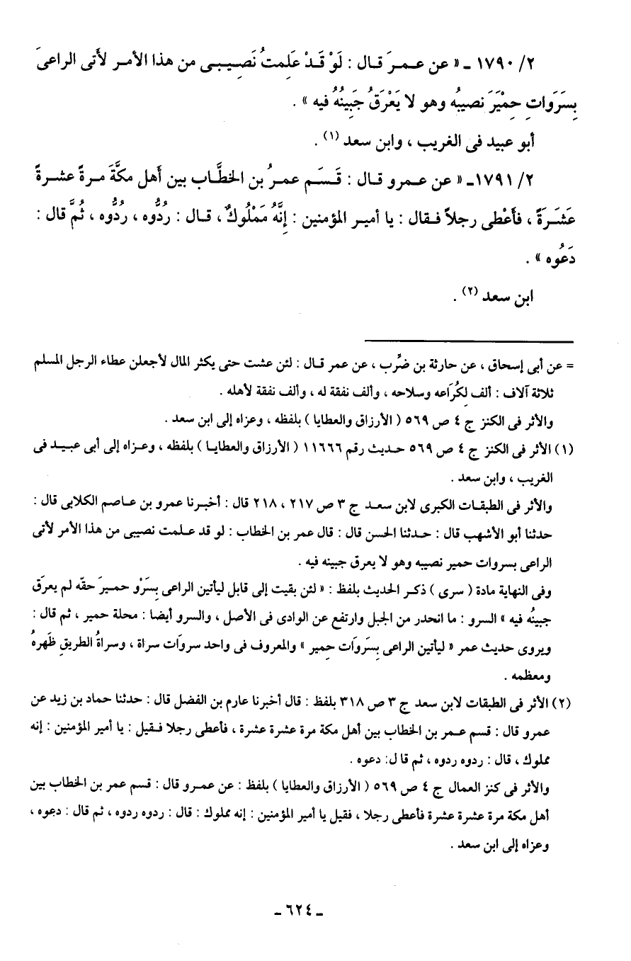 2/ 1791 - "عن عمرو قال: قَسَم عمرُ بن الخطَّاب بين أهل مكَّةَ مرةً عشرةً عَشَرَةً، فأَعْطى رجلًا فقال: يا أمير المؤمنين: إِنَّهُ مَمْلُوكٌ، قال: رُدُّه، رُدُّوه، ثُمَّ قال: دَعُوه".