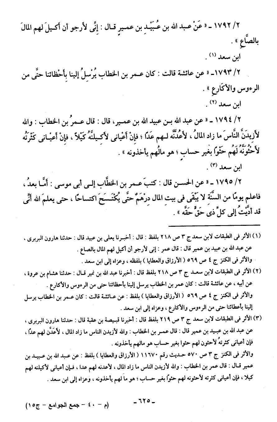 2/ 1794 - "عن عبد اللَّه بن عبيد اللَّه بن عمير، قال: قال عمرُ بن الخطاب: واللَّه لأَزيدَنَّ النَّاسَ ما زاد المالُ، لأعُدَّنَّه لهم عَدًا؛ فإِنْ أعْيانى لأكِيلنَّهُ كَيْلًا، فإِنْ أَعيْانى كَثْرَتُه لأحْثُوَنَّهُ لَهُمْ حَثْوًا بغير حسابٍ؛ هو مالُهم يأخذونه".