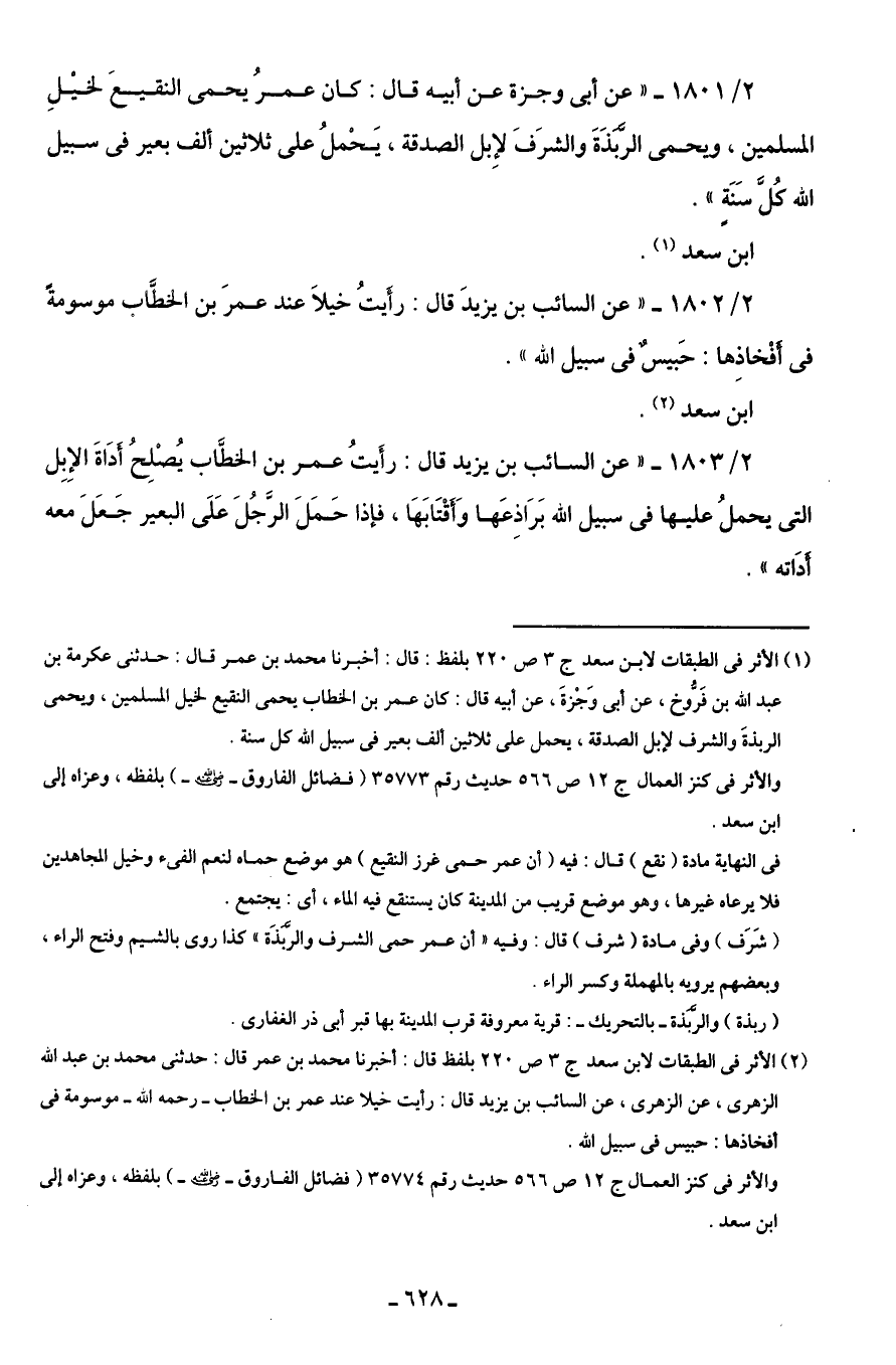 2/ 1801 - "عن أَبى وجزة عن أبيه قال: كان عمرُ يحمى النقيعَ لخيْلِ المسلمين، ويحمى الرَّبذَةَ والشرَفَ لإِبل الصدقة، يَحْملُ على ثلاثين ألف بعير في سبيل اللَّه كُلَّ سَنَةٍ".
