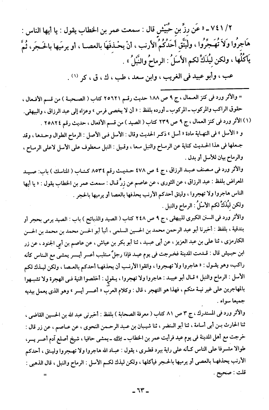 2/ 741 - "عَن زِرِّ بنِ حُبَيْشٍ قال: سمعت عمر بن الخطاب يقول: يَا أيها الناس: هَاجِرُوا وَلَا تُهَجِّرُوا، ولْيَتَّقِ أَحَدُكُمُ الأَرنب، أنْ يحْذِفَهَا بالعصا، أو يرميها بالحَجَر، ثُمَّ يَأكُلُها، ولكن لِيُذَكِّ لكم الأَسَلُ: الرماحُ والنَّبْلُ".