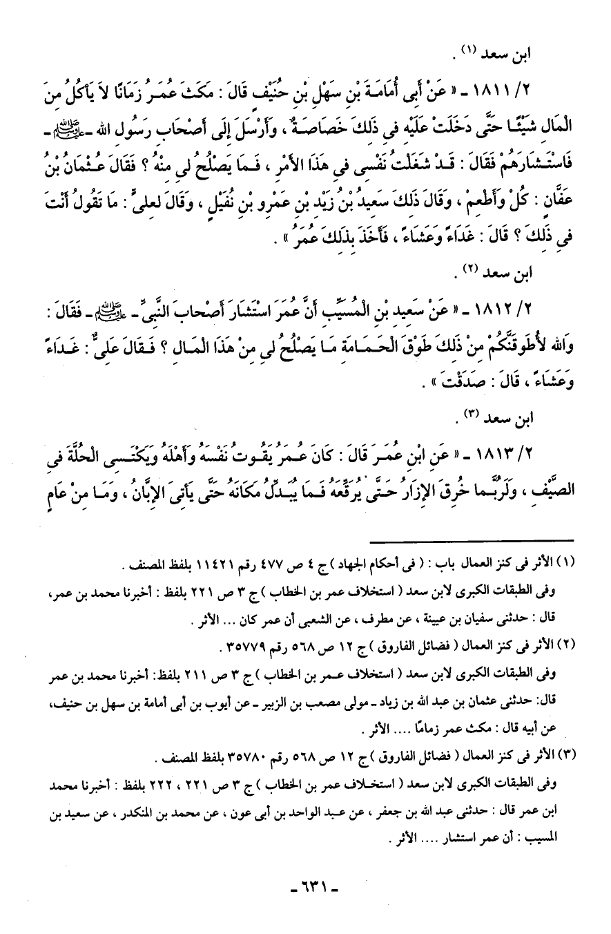 2/ 1811 - "عَنْ أَبِى أُمَامَةَ بْنِ سَهْلِ بْنِ حُنَيْفٍ قَالَ: مَكَثَ عُمَرُ زَمَانًا لَا يَأْكُلُ مِنَ الْمَالِ شَيْئًا حَتَّى دَخَلَتْ عَلَيْه فِى ذَلِكَ خَصَاصَةٌ، وَأَرْسَلَ إِلَى أَصْحَابِ رَسُولِ اللَّه -صلى اللَّه عليه وسلم- فَاسْتَشَارَهُمْ فَقَالَ: قَدْ شَغَلْتُ نَفْسِى في هَذَا الأَمْرِ، فَمَا يَصْلُحُ لِى مِنْهُ؟ فَقَالَ عُثْمَانُ بْنُ عَفانٍ: كُلْ وَأَطْعِمْ، وَقَالَ ذَلِكَ سَعِيدُ بْنُ زَيْدِ بْنِ عَمْرِو بْنِ نُفَيْلٍ، وَقَالَ لعِلىٍّ: مَا تَقُولُ أَنْتَ في ذَلِكَ؟ قَالَ: غَدَاءً وَعَشَاءً، فَأَخَذَ بِذَلِكَ عُمَرُ".