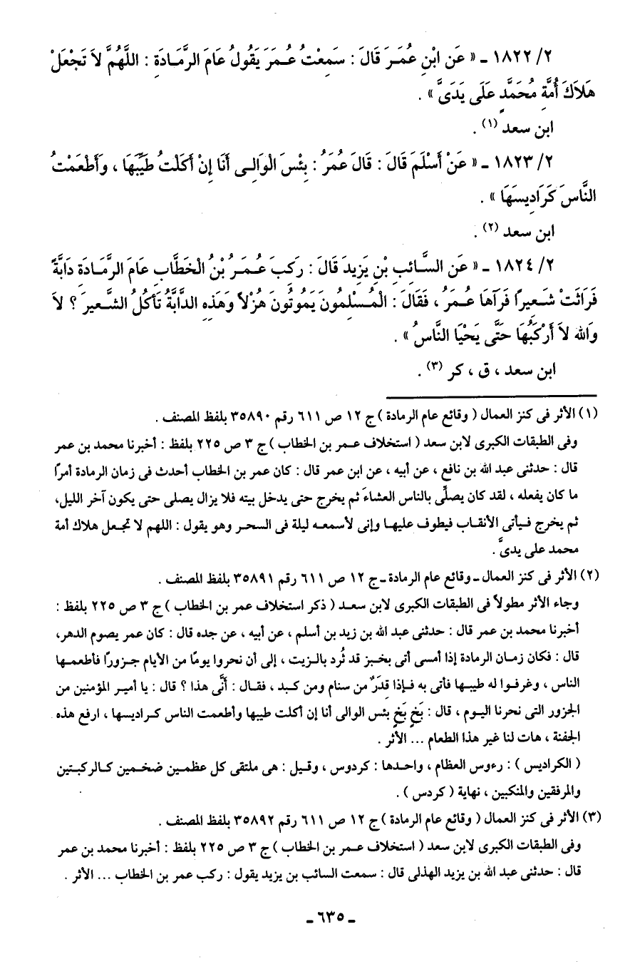 2/ 1822 - "عَن ابْنِ عُمَرَ قَالَ: سَمِعْتُ عُمَرَ يَقُولُ عَامَ الرَّمَادَةِ: اللَّهُمَّ لَا تَجْعَلْ هَلَاكَ أُمَّة مُحَمَّدٍ عَلَى يَدَىَّ".