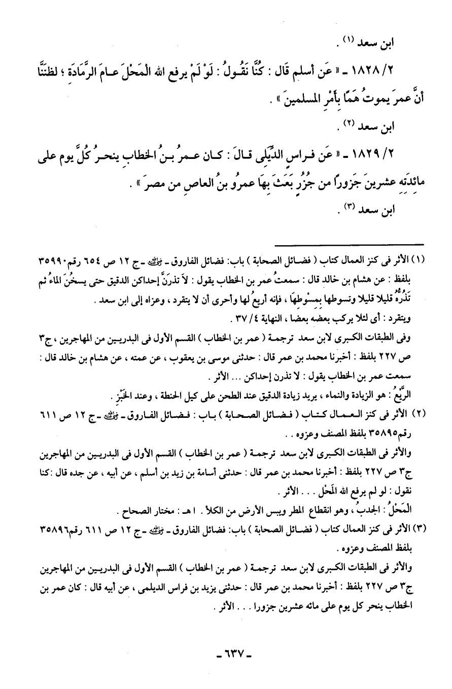 2/ 1828 - "عَن أسلم قَال: كُنَّا نَقُولُ: لَوْ لَمْ يرفع اللَّه الْمَحْلَ عامَ الرَّمَادَةِ؛ لظنَنَّا أَنَّ عمرَ يموتُ هَمًا بأَمْرِ المسلمينَ".