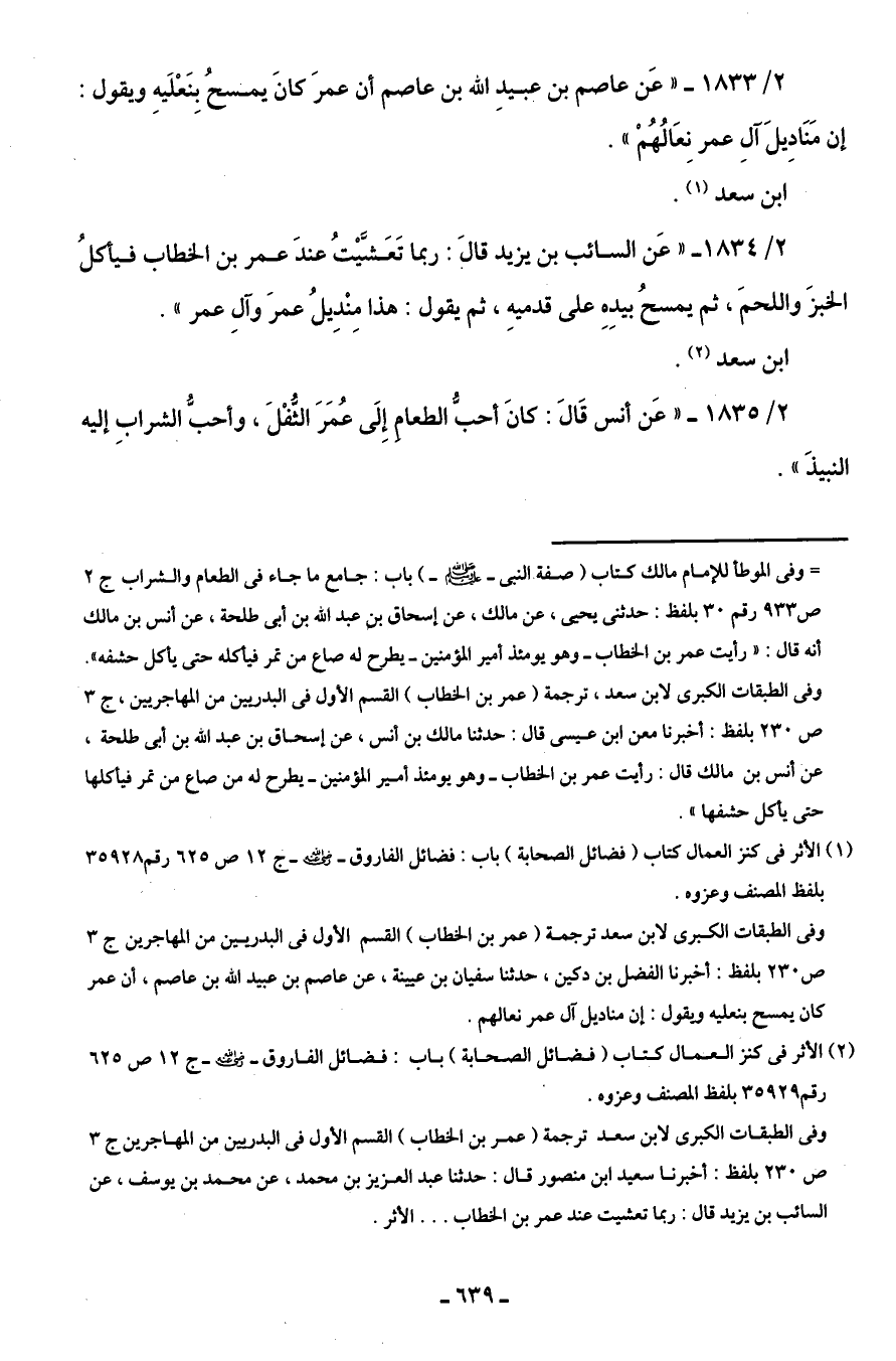 2/ 1834 - "عَن السائب بن يزيد قالَ: ربما تَعَشَّيْتُ عندَ عمر بن الخطاب فيأكلُ الخبزَ واللحمَ، ثم يمسحُ بيدِهِ على قدميهِ، ثم يقول: هذا مِنْدِيلُ عمرَ وآلِ عمر".