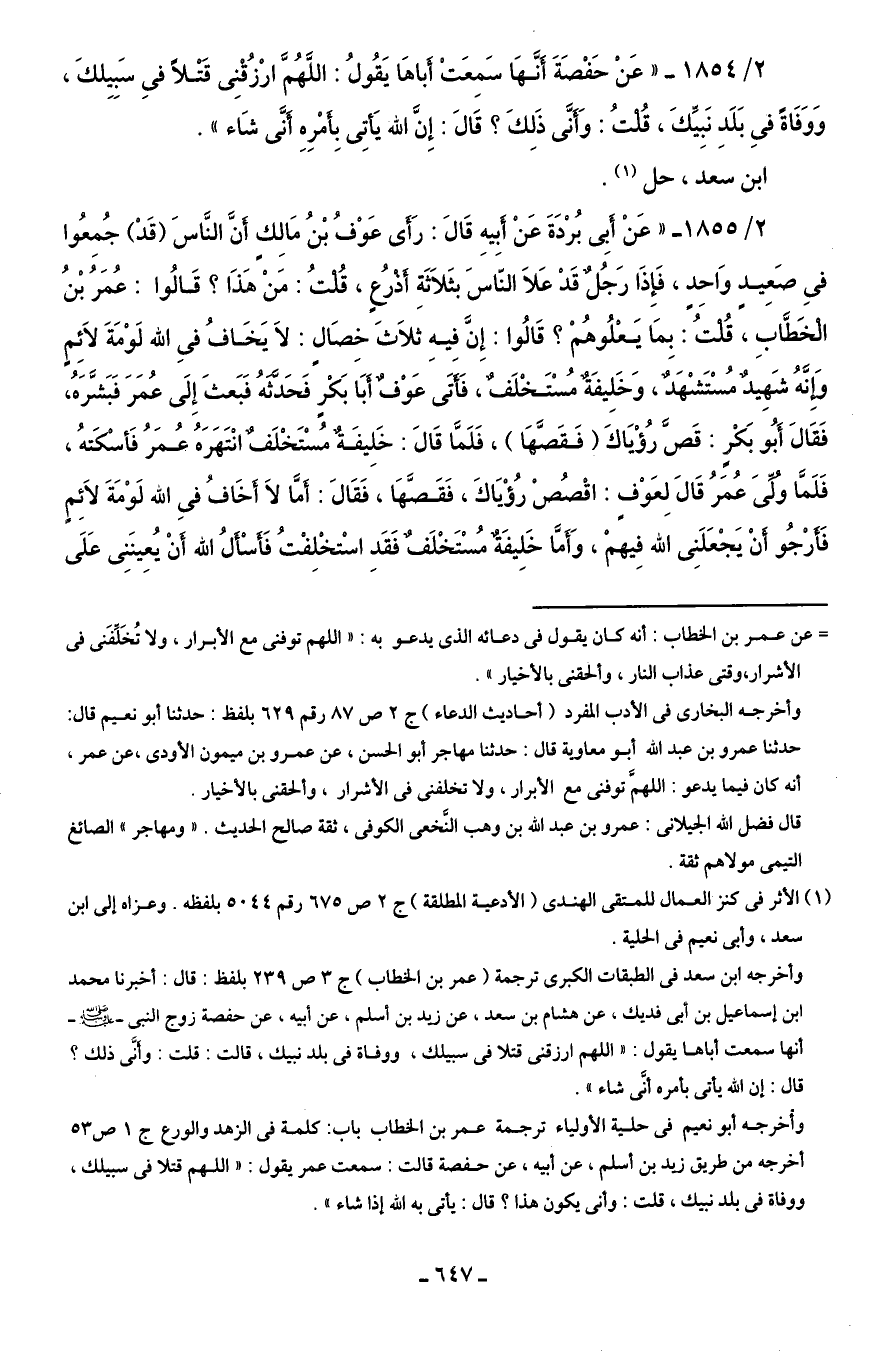 2/ 1854 - "عَنْ حَفْصَةَ أنَّهَا سَمِعَتْ أَبَاهَا يَقُولُ: اللَّهُمَّ ارْزُقْنِى قَتْلًا فِى سَبِيِلكَ، وَوَفَاةً فِى بَلَدِ نَبِيِّكَ، قُلتُ: وَأَنَّى ذَلِكَ؟ قَالَ: إِنَّ اللَّه يَأْتِى بِأَمْرِهِ أَنَّى شَاء".