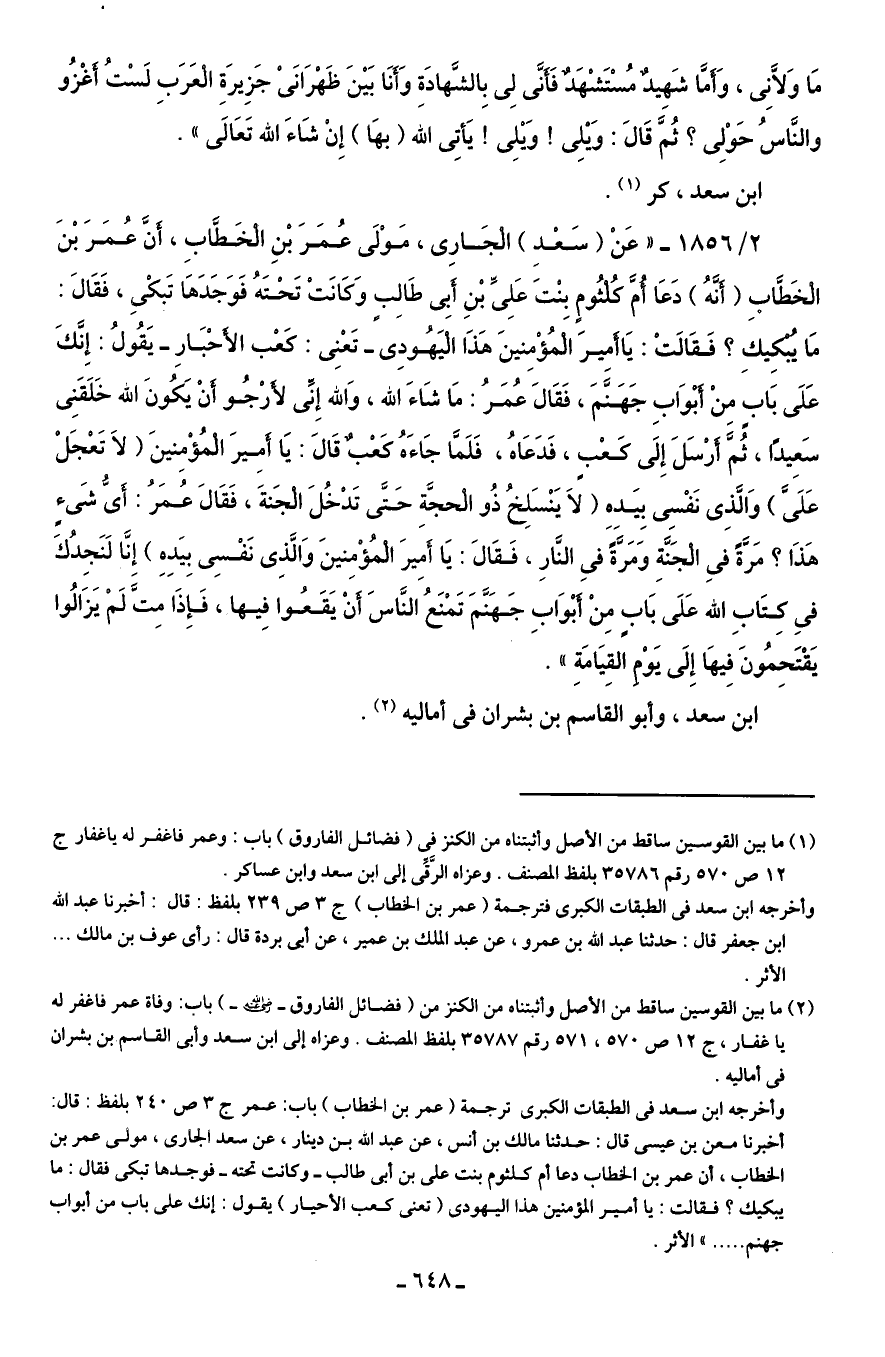 2/ 1856 - "عَنْ (سَعْدِ) الْجَارِى، مَوْلَى عُمَرَ بْنِ الْخَطَّابِ، أَنَّ عُمَرَ بْنَ الْخَطَّابِ (أَنَّهُ) دَعَا أُمَّ كُلثُومٍ بنْتَ عَلِىِّ بْنِ أَبِى طَالبٍ وَكَانَتْ تَحْتَهُ فَوَجَدَهَا تَبكْى، فَقَالَ: مَا يُبْكِيكِ؟ فَقَالَتْ: يَا أميرَ الْمُؤْمِنينَ هَذَا الْيَهودِى -تَعْنِى: كَعْب الأَخْبَارِ- يَقُولُ: إِنَّكَ عَلَى بَابِ مِنْ أَبْوَابِ جَهَنَّمَ، فَقَالَ عُمَرُ: مَا شَاءَ اللَّه، وَاللَّه إِنِّى لأَرْجُو أَنْ يَكُونَ اللَّه خَلَقَنِى سَعِيدًا، ثُمَّ أَرْسَلَ إِلَى كَعْبٍ، فَدَعَاهُ، فَلَمَّا جَاءَهُ كَعْبٌ قَالَ: يَا أَميرَ الْمُؤْمِنينَ (لَا تَعْجَلْ عَلَىَّ) وَالَّذِى نَفْسِى بِيَدِهِ (لا يَنْسَلِخُ ذُو الْحجَّةِ حَتَّى تَدْخُلَ الْجَنَّةَ، فَقَالَ عُمَرُ: أى شَىْءٍ هَذَا؟ مَرَّةٍ فِى الْجَنَّةِ وَمَرَّةٍ فِى النَّارِ، فَقَالَ: يَا أَمِيرَ الْمُؤْمِنينَ وَالَّذِى نَفْسِى بِيَدِهِ) إِنَّا لَنَجِدُكَ فِى كِتَابِ اللَّه عَلَى بَابٍ مِنْ أبْوَابِ جَهَنَّمَ تَمْنَعُ النَّاسَ أَنْ يَقَعُوا فِيهَا، فَإِذَا مِتَّ لَمْ يَزَالُوا يَقْتَحِمُونَ فِيهَا إِلَى يَوْمِ الْقِيَامَةِ".
