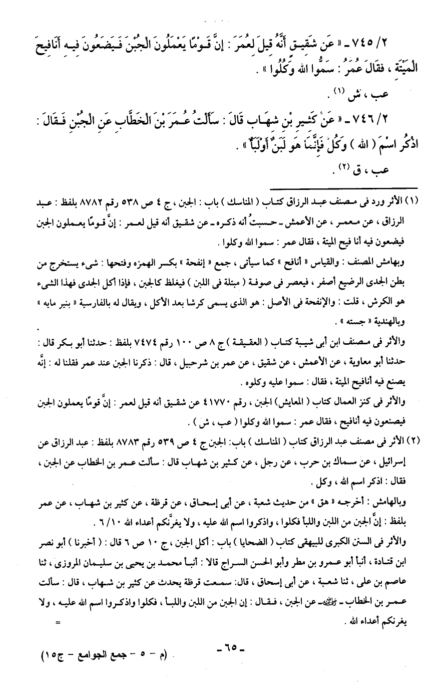 2/ 745 - "عَن شَقِيقٍ أَنَّهُ قِيلَ لِعُمَرَ: إنَّ قَوْمَا يَعْمَلُونَ الجُبْنَ فَيَضَعُونَ فِيهِ أَنَافِيحَ الْمَيْتَةِ، فقَالَ عُمَرُ: سَمُّوا الله وَكُلُوا".