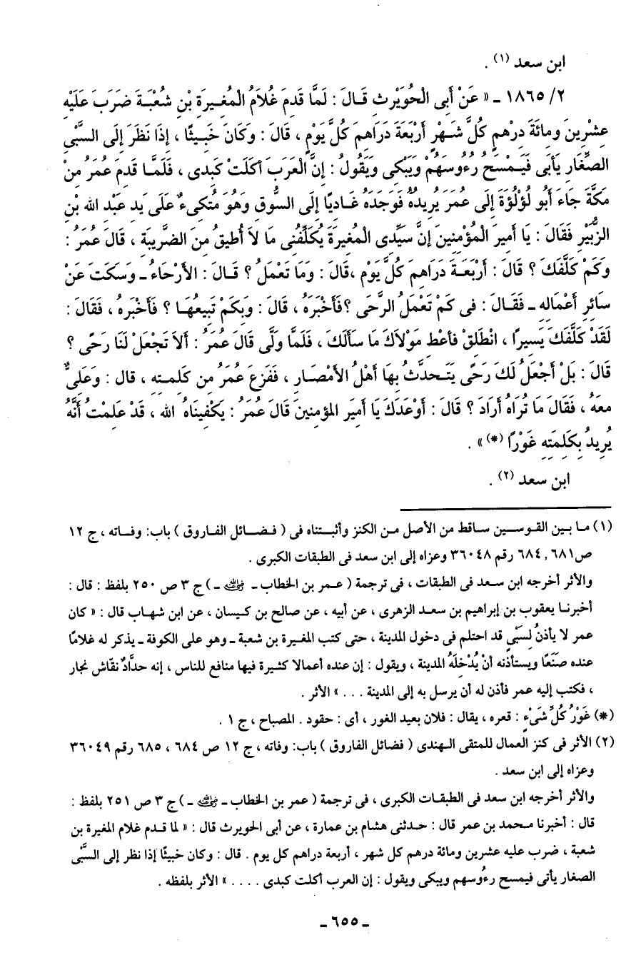 2/ 1865 - "عَنْ أَبِى الْحُوَيْرثِ قَالَ: لَمَّا قَدمَ غُلَامُ الْمُغِيرَةِ بْنِ شُعْبَةَ ضَرَبَ عَلَيْه عِشْرِينَ ومِائَةَ دِرْهَمٍ كُلَّ شَهْرٍ أَرْبَعَةَ دَرَاهِمَ كُلَّ يَوْمٍ، قَالَ: وَكَانَ خَبِيثًا، إِذَا نَظَرَ إِلَى السَّبْى الصِّغَارِ يَأبَى فَيمْسَحُ رُءُوسَهُمْ وَيَبْكِى وَيَقُولُ: إِنَّ الْعَرَبَ أَكَلَتْ كَبِدى، فَلَمَّا قَدِمَ عُمَرُ مِنْ مَكَّةَ جَاءَ أَبُو لُؤْلُؤَةَ إِلَى عُمَرَ يُرِيدُهُ فَوَجَدَهُ غَاديًّا إِلَى السُّوقِ وَهُوَ مُتكِئٌ عَلَى يَدِ عَبْد اللَّه بْنِ الزُّبَيْرِ فَقَالَ: يَا أَمِيرَ الْمُؤْمِنِينَ إنَّ سَيِّدى الْمُغِيرَةَ يُكَلِّفُنِى مَا لَا أُطيقُ مِنَ الضَّريبَة، قَالَ عُمَرُ: وَكَمْ كَلَّفَكَ؟ قَالَ: أَرْبَعةَ دَرَاهِمَ كُلَّ يَوْم، قَالَ: وَمَا تَعْمَلُ؟ قَالَ: الأَرْحَاءُ -وَسَكَتَ عَنْ سَائِرِ أَعْمَالِهِ- فَقَالَ: في كَمْ تَعْمَلُ الرَّحَى؟ فَأَخْبَرَهُ، قَالَ: وَبِكَمْ تَبِيعُهَا؟ فَأَخْبَرهُ، فَقَالَ: لَقَدْ كَلَّفَكَ يَسِيرًا، انْطَلِق فأعْطِ مَوْلَاكَ مَا سَأَلَكَ، فَلَمَّا وَلَّى قالَ عُمَرُ: أَلَا تَجْعَلْ لَنَا رَحًى؟ قَالَ: بَلْ أَجْعَلُ لَكَ رَحًى يَتَحدَّثُ بِهَا أَهْلُ الأَمْصَارِ، فَفَزعَ عُمَرُ مِن كَلِمتِهِ، قال: وَعَلىٌّ معَهُ، فَقَالَ مَا تُرَاهُ أَرَادَ؟ قَالَ: أَوْعَدَكَ يَا أَمِيَر المؤمِنينَ قَالَ عُمَرُ: يَكْفِينَاهُ اللَّه، قَدْ عَلِمْتُ أَنَّهُ يُرِيدُ بِكَلِمَتِهِ غَوْرًا (*) ".