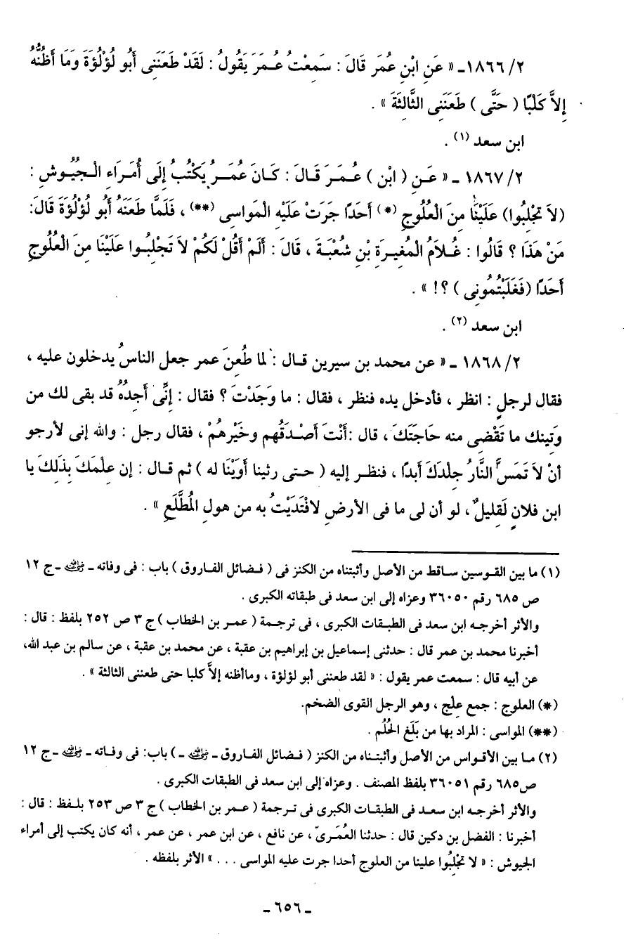 2/ 1866 - "عَنِ ابْنِ عُمَر قَالَ: سَمِعْتُ عُمَرَ يَقُولُ: لَقَدْ طَعَنَنِى أَبُو لُؤْلُؤَةَ وَمَا أظُنُّهُ إِلَّا كَلْبًا (حَتَّى) طَعَنَنِى الثَّالِثَةَ".