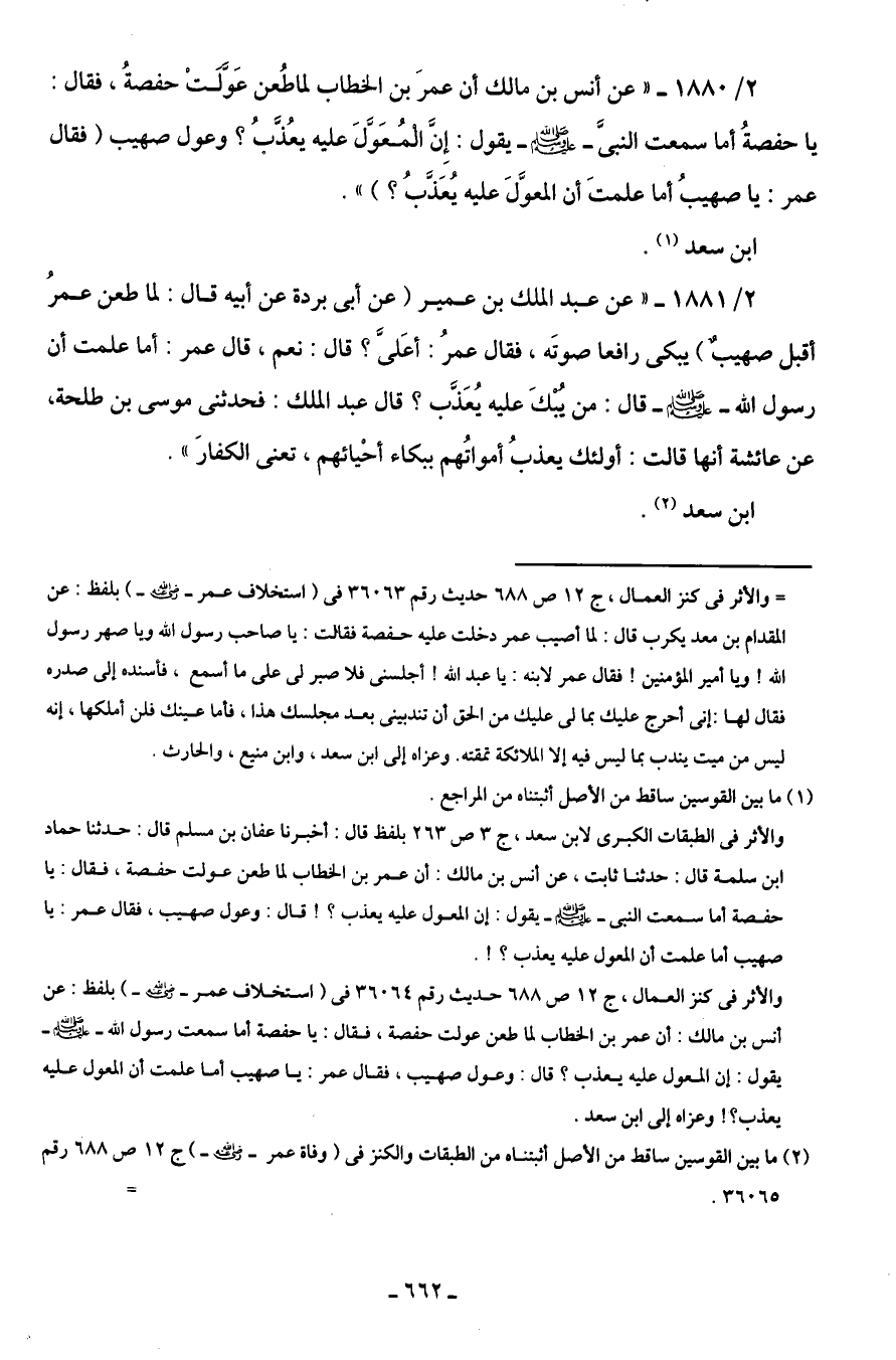 والأثر في كنز العمال، جـ 12 ص 688 حديث رقم 36064 في (استخلاف عمر -رضي اللَّه عنه-) بلفظ: عن أَنس بن مالك! أن عمر بن الخطاب لما طعن عولت حفصة، فقال: يا حفصة أما سمعت رسول اللَّه -صلى اللَّه عليه وسلم- يقول: إن المعول عليه يعذب؟ قال: وعول صهيب، فقال عمر: يا صهيب أما علمت أن المعول عليه يعذب؟ ! وعزاه إلى ابن سعد.