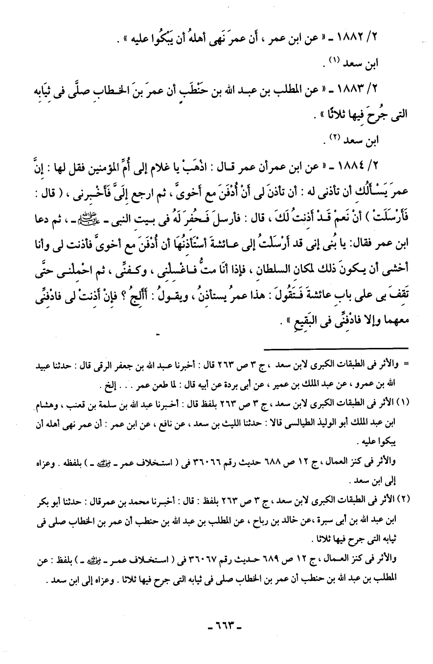 (¬1) الأثر في الطبقات الكبرى لابن سعد، جـ 3 ص 263 بلفظ قال: أخبرنا عبد اللَّه بن سلمة بن قعنب، وهشام ابن عبد الملك أبو الوليد الطيالسى قالا: حدثنا الليث بن سعد، عن نافع، عن ابن عمر: أن عمر نهى أهله أن يبكوا عليه.