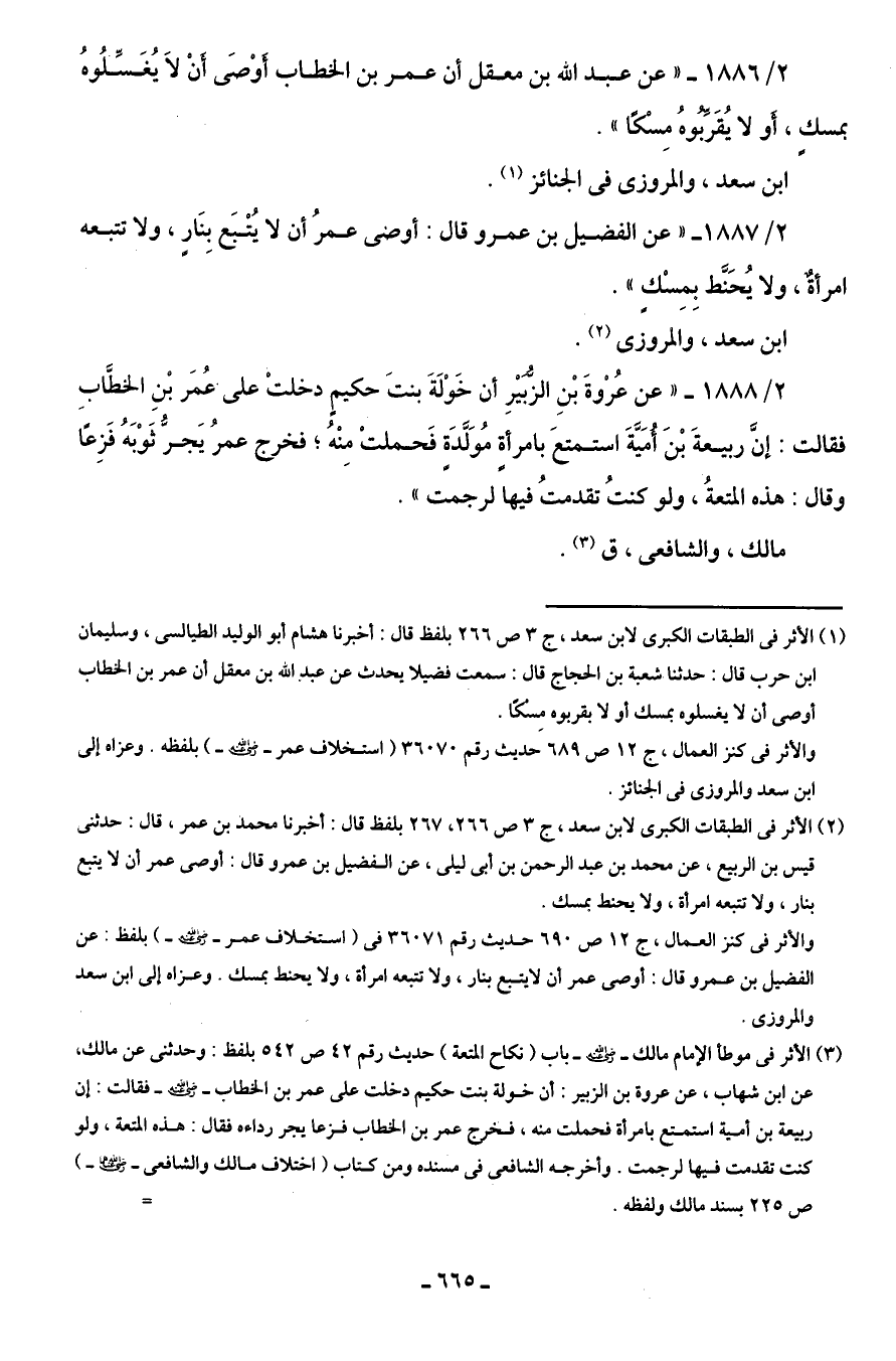 (¬1) الأثر في الطبقات الكبرى لابن سعد، جـ 3 ص 266 بلفظ قال: أخبرنا هشام أبو الوليد الطيالسى، وسليمان ابن حرب قال: حدثنا شعبة بن الحجاج قال: سمعت فضيلا يحدث عن عبد اللَّه بن معقل أن عمر بن الخطاب أوصى أن لا يغسلوه بمسك أو لا يقربوه مِسكًا.