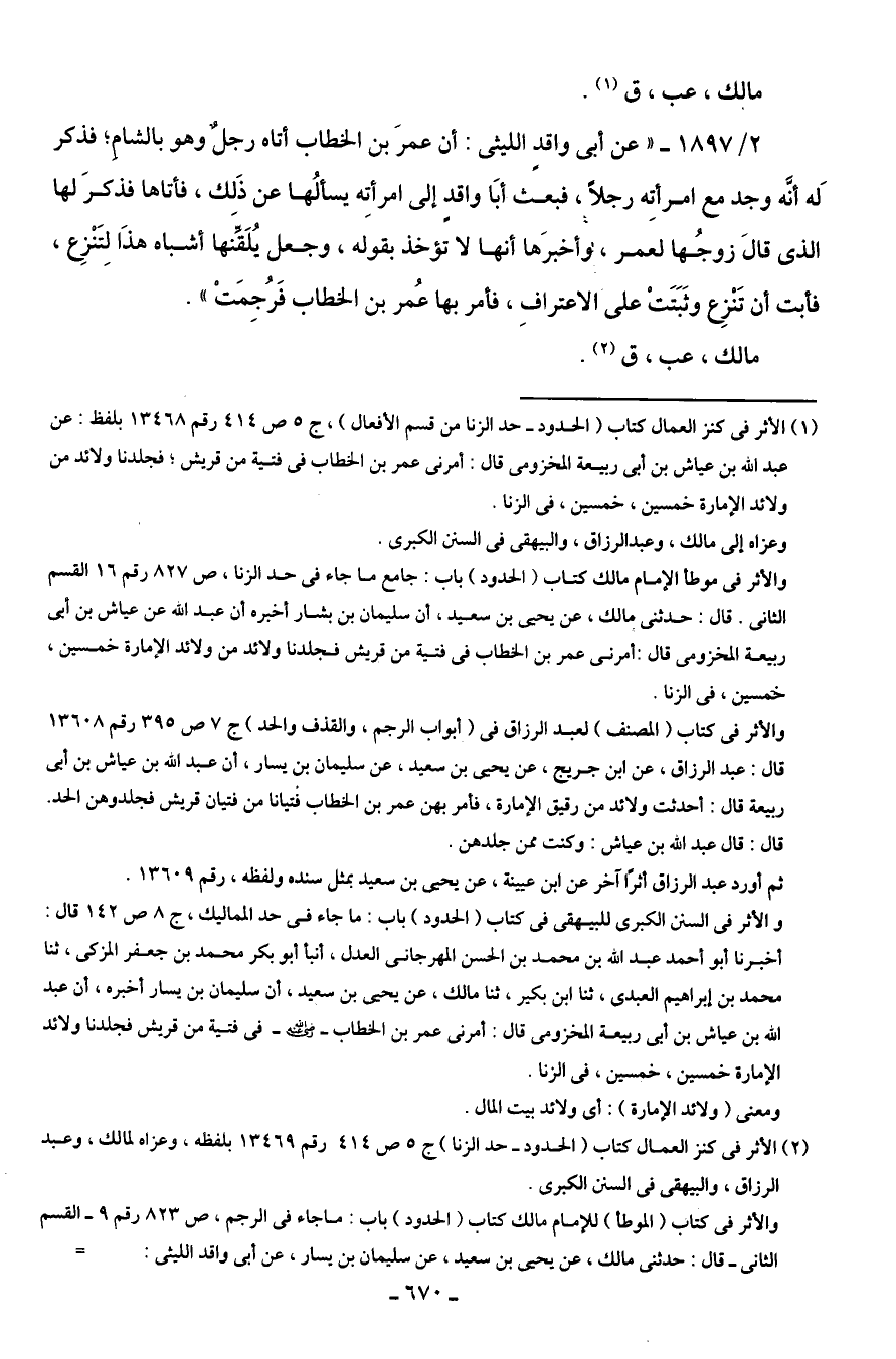 (¬2) الأثر في كنز العمال كتاب (الحدود - حد الزنا) جـ 5 ص 414 رقم 13469 بلفظه، وعزاه لمالك، وعبد الرزاق، والبيهقى في السنن الكبرى.