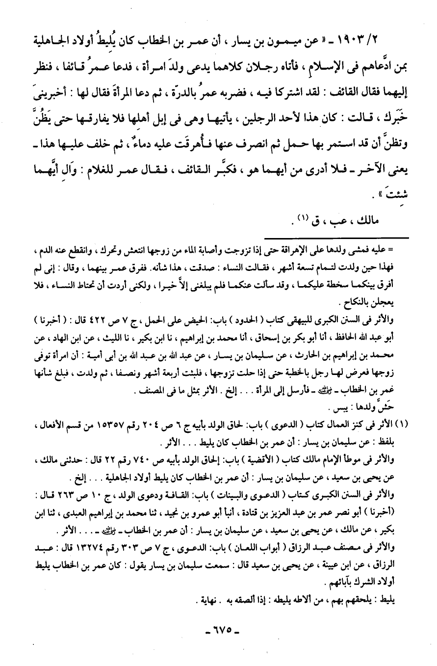 (¬1) الأثر في كنز العمال كتاب (الدعوى) باب: لحاق الولد بأبيه جـ 6 ص 204 رقم 15357 من قسم الأفعال، بلفظ: عن سليمان بن يسار: أن عمر بن الخطاب كان يليط. . . الأثر.