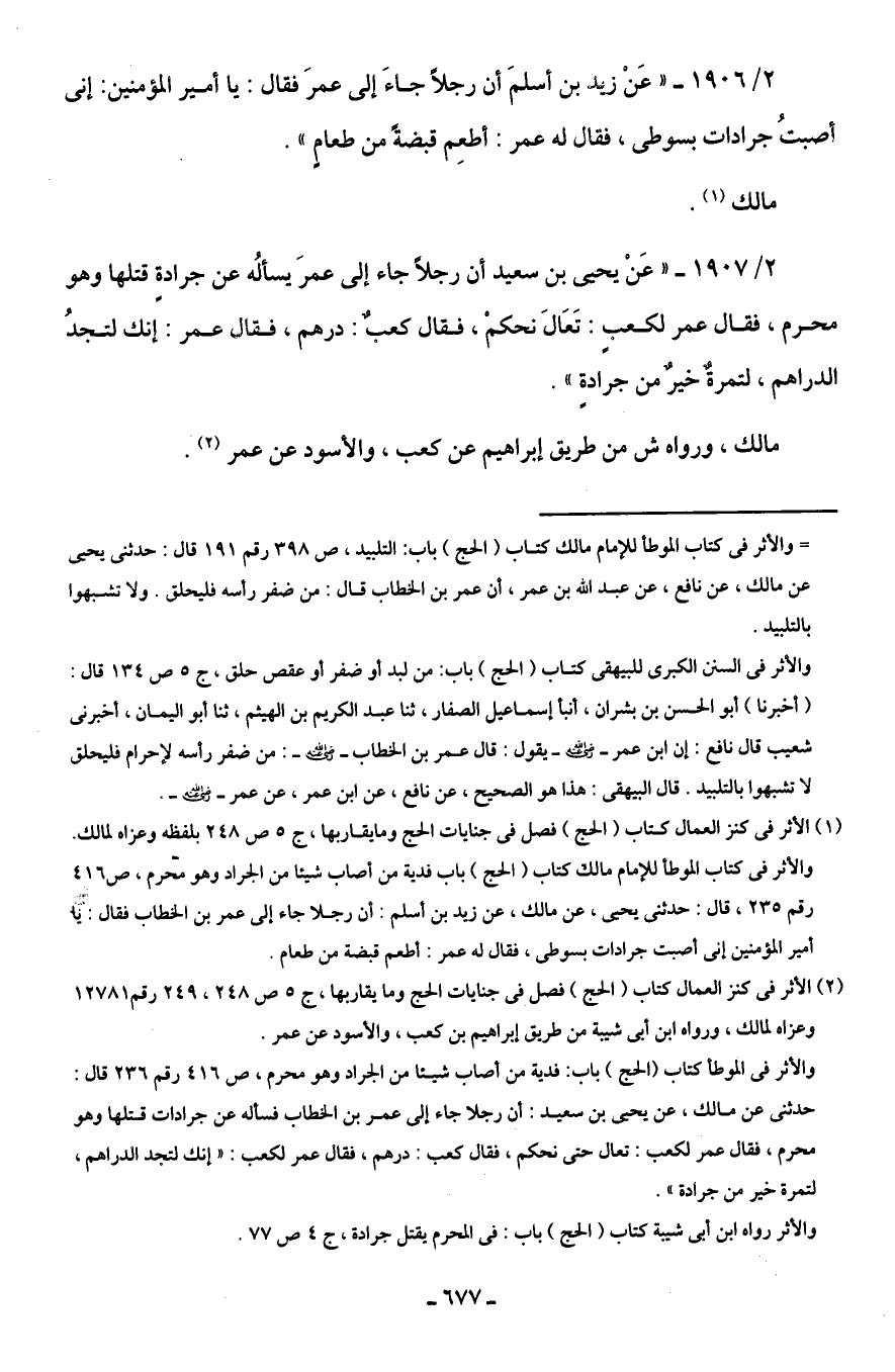 (¬1) الأثر في كنز العمال كتاب (الحج) فصل في جنايات الحج وما يقاربها، جـ 5 ص 248 بلفظه وعزاه لمالك. والأثر في كتاب الموطأ للإمام مالك كتاب (الحج) باب فدية من أصاب شيئا من الجراد وهو محرم، ص 416 رقم 235، قال: حدثنى يحيى، عن مالك، عن زيد بن أسلم: أن رجلا جاء إلى عمر بن الخطاب فقال: يا أمير المؤمنين إنى أصبت جرادات بسوطى، فقال له عمر: أطعم قبضة من طعام.