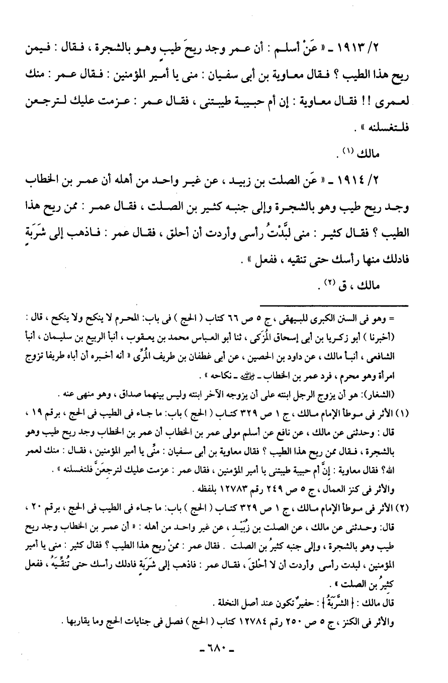 (¬1) الأثر في موطأ الإمام مالك، جـ 1 ص 329 كتاب (الحج) باب: ما جاء في الطيب في الحج، برقم 19، قال: وحدثنى عن مالك، عن نافع عن أسلم مولى عمر بن الخطاب أن عمر بن الخطاب وجد ريح طيب وهو بالشجرة، فقال ممن ريح هذا الطيب؟ فقال معاوية بن أَبى سفيان: منى يا أمير المؤمنين، فقال: منك لعمر اللَّه؟ فقال معاوية: إِنَّ أم حبيبة طيبتنى يا أمير المؤمنين، فقال عمر: عزمت عليك لترجِعَنَّ فلتغسلنه".