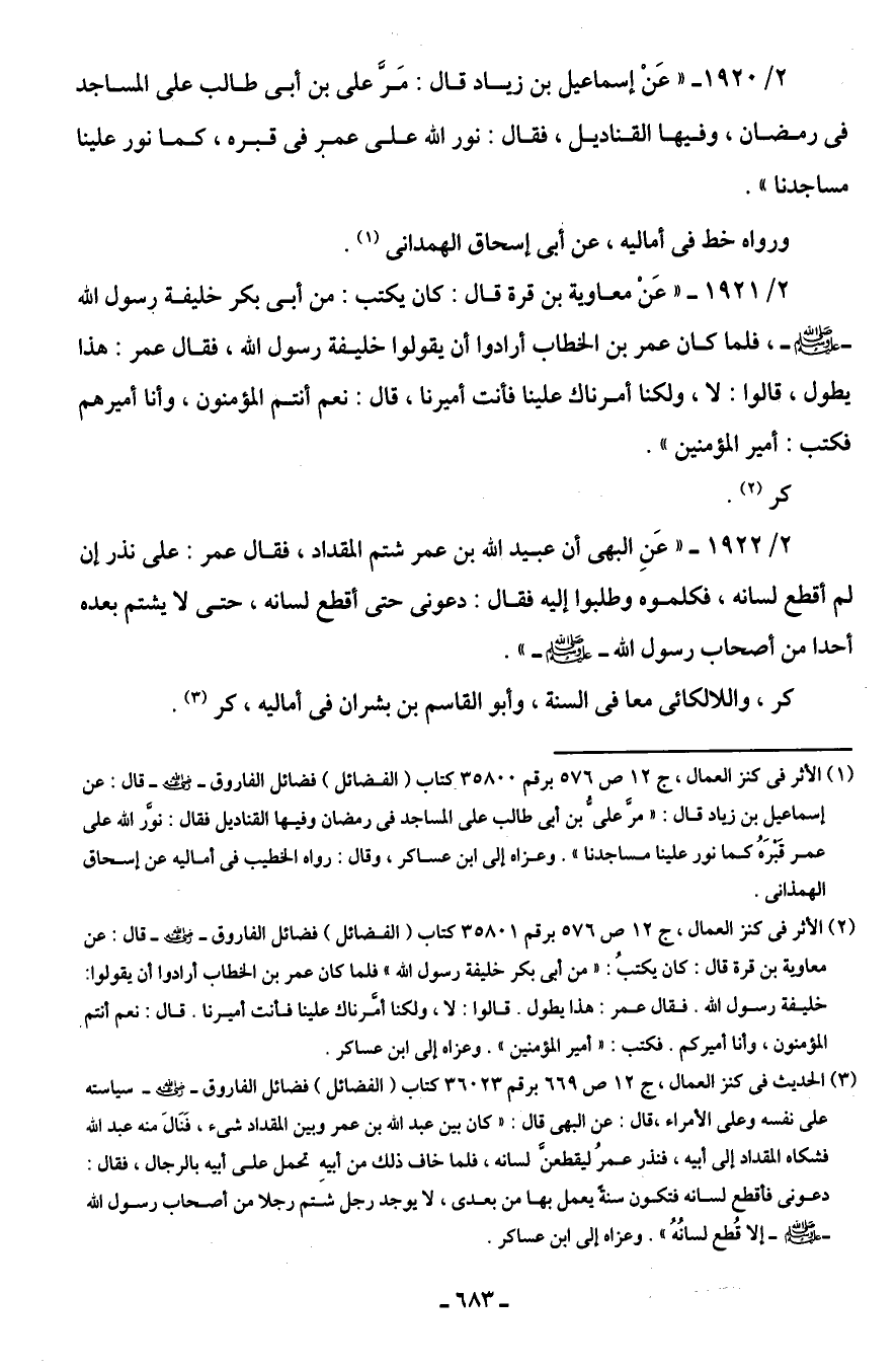(¬1) الأثر في كنز العمال، جـ 12 ص 576 برقم 35800 - كتاب (الفضائل) فضائل الفاروق -رضي اللَّه عنه- قال: عن إسماعيل بن زياد قال: "مرَّ علىُّ بن أَبى طالب على المساجد في رمضان وفيها القناديل فقال: نوَّر اللَّه على عمر قَبْرَهُ كما نور علينا مساجدنا". وعزاه إلى ابن عساكر، وقال: رواه الخطيب في أماليه عن إسحاق الهمذانى.
