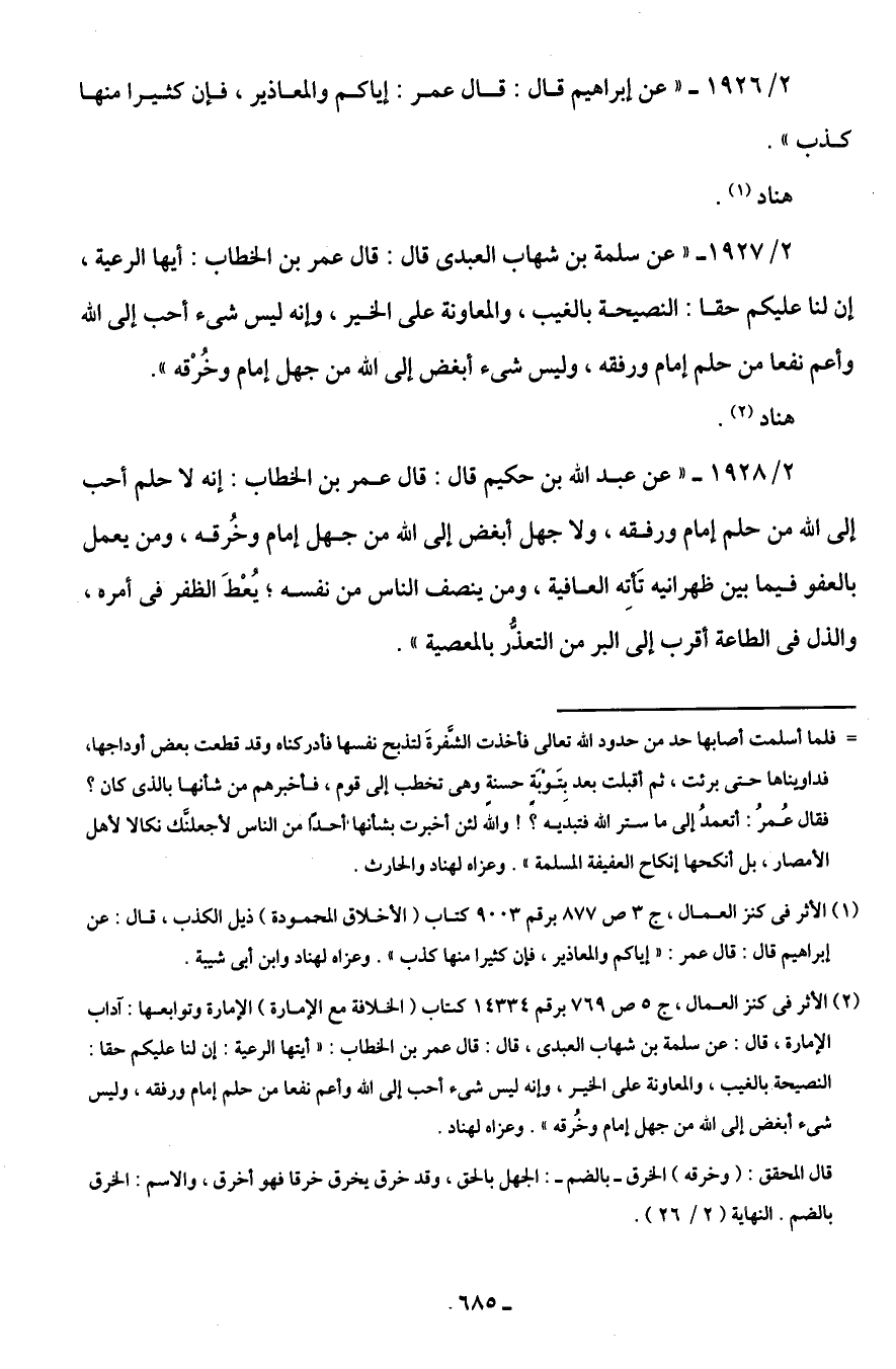 (¬1) الأثر في كنز العمال، جـ 3 ص 877 برقم 9003 كتاب (الأخلاق المحمودة) ذيل الكذب، قال: عن إبراهيم قال: قال عمر: "إياكم والمعاذير، فإن كثيرا منها كذب". وعزاه لهناد وابن أَبى شيبة.