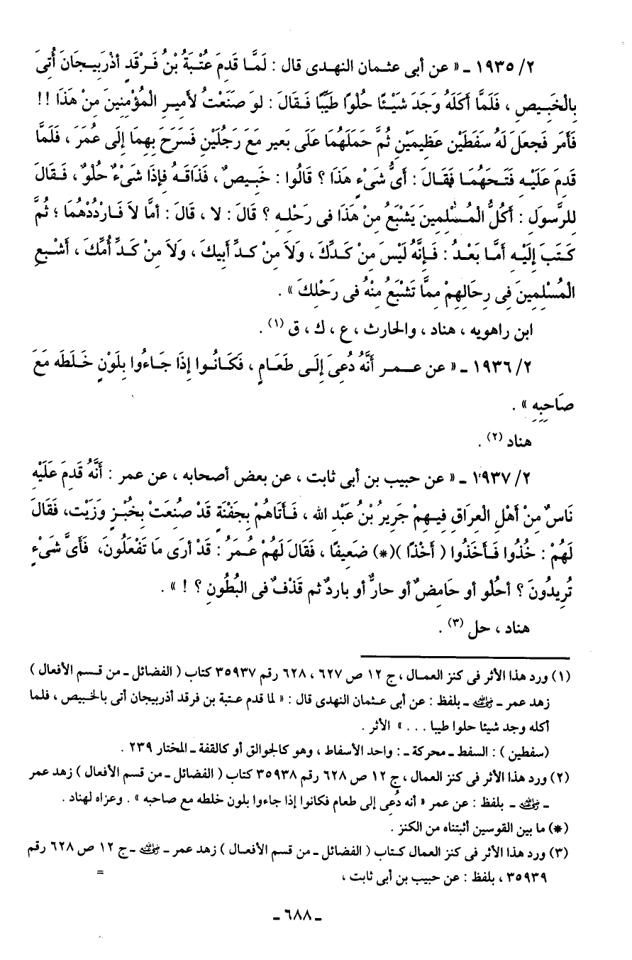 (¬1) ورد هذا الأثر في كنز العمال، جـ 12 ص 627، 628 رقم 35937 كتاب (الفضائل - من قسم الأفعال) زهد عمر -رضي اللَّه عنه- بلفظ: عن أَبى عثمان النهدى قال: "لما قدم عتبة بن فرقد أذربيجان أتى بالخبيص، فلما أكله وجد شيئا حلوا طيبا. . . " الأثر.