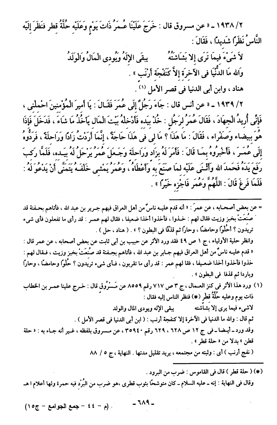 (¬1) ورد هذا الأثر في كنز العمال، جـ 3 ص 717 رقم 8559 عن مَسْرُوقٍ قال: خرج علينا عمر بن الخطاب ذات يوم وعليه حُلَّةُ قِطرٍ (*) فنظر الناس إليه فقال:
