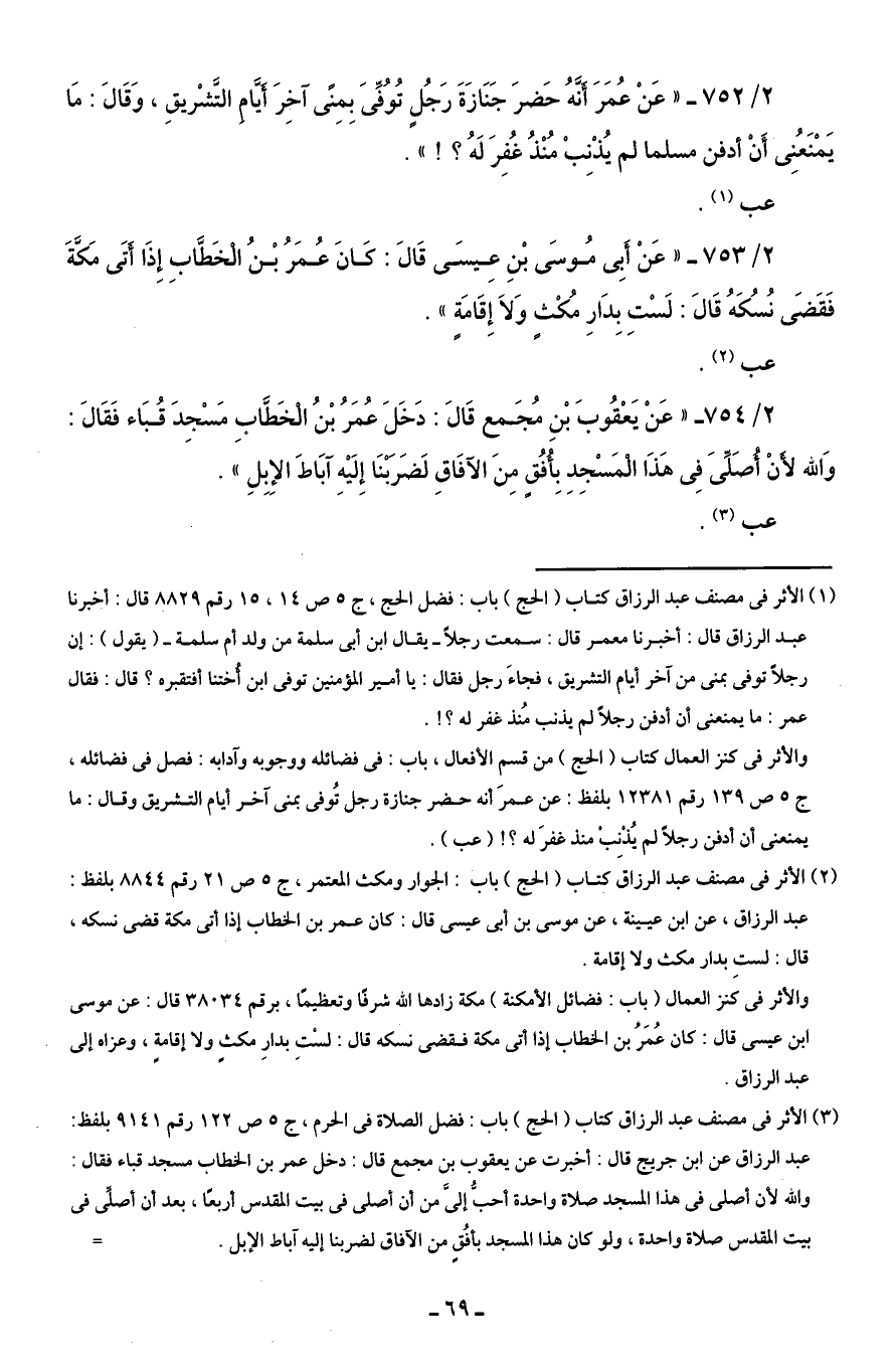 2/ 752 - "عَنْ عُمَرَ أَنَّهُ حَضرَ جَنَازَةَ رَجُلٍ تُوُفَىَ بِمِنًى آخِرَ أَيَّامِ التَّشْريقِ، وَقَالَ: مَا يَمْنَعُنِى أَنْ أدفن مسلما لم يُذْنِبْ مُنْذُ غُفِرَ لَهُ؟ ! ".