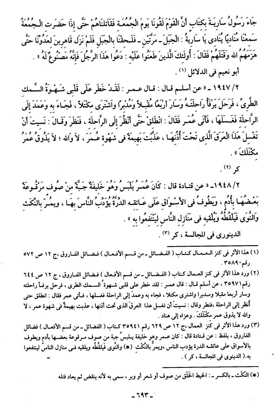 2/ 1948 - "عن قتادة قال: كَانَ عُمَرُ يَلْبَسُ وَهُوَ خَلِيفَةٌ جَبة مِنْ صُوفٍ مَرقُوعَةً بَعْضُها بأُدُم، وَيَطُوفُ في الأَسْوَاقِ عَلَى عَاتِقِه الدِّرَّةُ يُؤَدِّبُ النَّاسَ بِها، ويمُرّ بِالنِّكَثِ وَالنَّوَى فَيَلْقُطُهُ وَيُلْقيهِ في مَنَازِلِ النَّاسِ لِيَنْتَفِعُوا بِهِ".