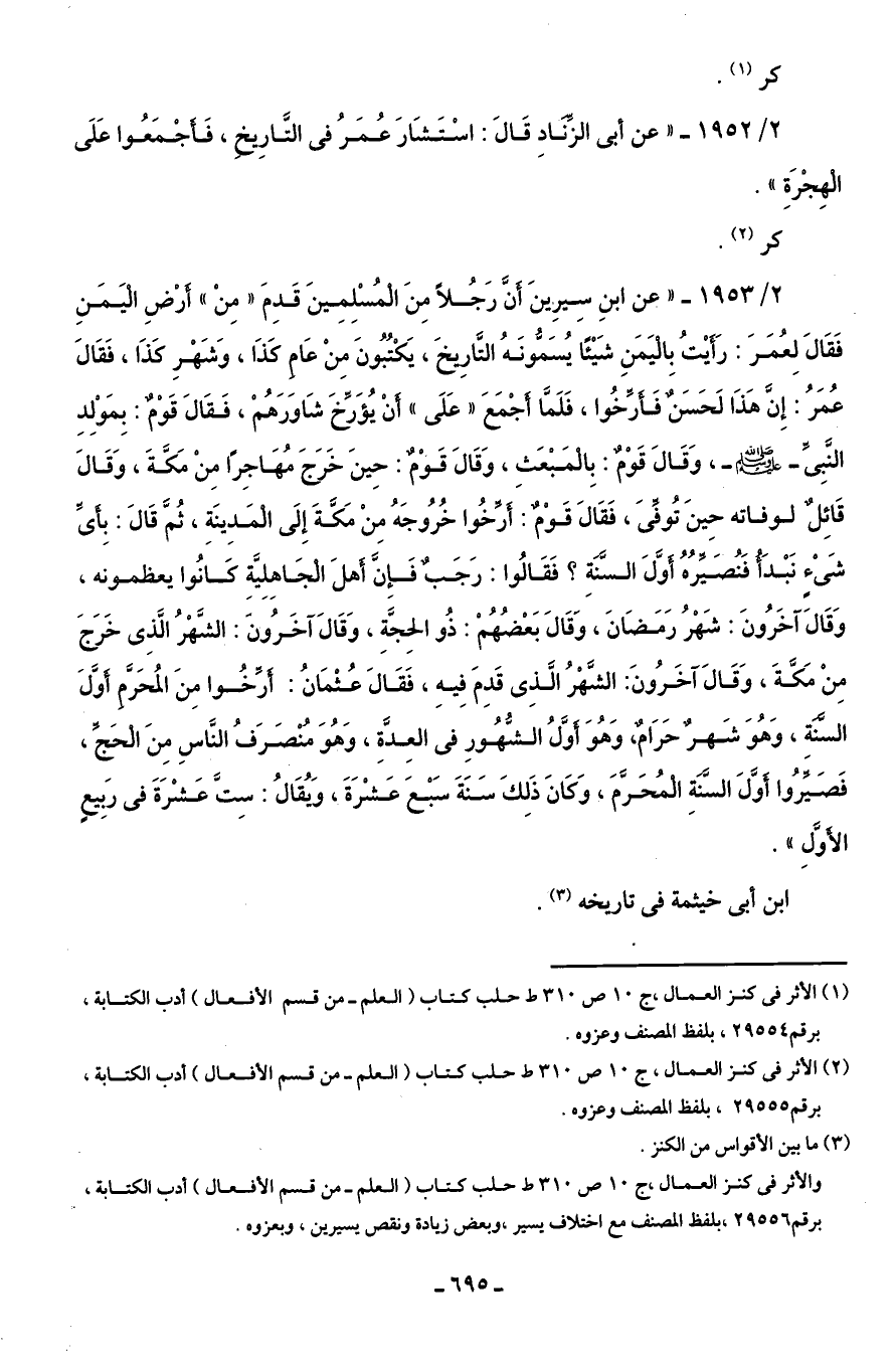 2/ 1953 - "عن ابنِ سِيرِينَ أَنَّ رَجُلًا مِنَ الْمُسْلِمِينَ قَدِمَ "مِنْ" أَرْضِ اليَمَنِ فَقَالَ لِعُمَرَ: رَأَيْتُ باليَمَنِ شَيْئًا يُسَمُّونَهُ التَّارِيخَ، يَكْتُبُونَ مِنْ عَامِ كَذَا، وَشَهْرِ كَذَا، فَقَالَ عُمَرُ: إِنَّ هَذَا لَحَسَنٌ فَأرِّخُوا، فَلَمَّا أجْمَعَ "عَلَى" أَنْ يُؤَرِّخَ شَاوَرَهُمْ، فَقَالَ قَوْمٌ: بِمَوْلِدِ النَّبِىِّ -صلى اللَّه عليه وسلم-، وَقَالَ قَوْمٌ: بِالمَبْعَثِ، وَقَالَ قَوْمٌ: حِينَ خَرَجَ مُهَاجِرًا مِنْ مَكَّةَ، وَقَالَ قَائِلٌ لوفاته حِينَ تُوفِّى، فَقَالَ قَوْمٌ: أَرِّخُوا خُرُوجَهُ مِنْ مَكَّةَ إِلَى الْمَدِينَةِ، ثُمَّ قَالَ: بِأىِّ شَىْءٍ نَبْدَأُ فَنُصَيِّرُهُ أَوَّلَ السَّنَةِ؟ فَقَالُوا: رَجَبٌ فَإنَّ أَهلَ الجَاهِلِيَّة كَانُوا يعظمونه، وَقَالَ آخَرُونَ: شَهْرُ رَمَضَانَ، وَقَالَ بَعْضُهُمْ: ذُو الحِجَّةِ، وَقَالَ آخَرُونَ: الشَّهْرُ الَّذِى خَرَجَ مِنْ مَكَّةَ، وَقَالَ آخَرُونَ: الشَّهْرُ الَّذِى قَدِمَ فِيهِ، فَقَالَ عُثْمَانُ: أرِّخوا مِنَ المُحَرَّم أَوَّلَ السَّنَةِ، وَهُوَ شَهرٌ حَرَامٌ، وَهُوَ أَوَّلُ الشُّهُورِ في العِدَّةِ، وَهُوَ مُنْصَرَفُ النَّاسِ مِنَ الحَجِّ، فَصَيِّرُوا أَوَّلَ السَّنَةِ المُحَرَّمَ، وَكَانَ ذَلِكَ سَنَةَ سَبْعَ عَشْرَةَ، وَيُقَالُ: سِتَّ عَشْرَةَ في رَبِيعٍ الأَوَّلِ".