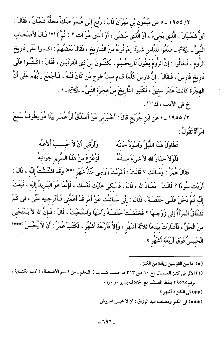 2/ 1954 - "عن مَيْمُونِ بْنِ مَهْرَانَ قَالَ: رُفِعَ إِلَى عُمَرَ صَكٌّ محلُّهُ شَعْبَانُ، فَقَالَ: أىُّ شَعْبَانَ: الَّذِى يَجِئُ، أَوْ الَّذِى مَضَى، أَوْ الَّذِى هُوَ آت؟ (ثُمَّ) (*) قَالَ لأَصْحَابِ النَّبىِّ -صلى اللَّه عليه وسلم- ضَعُوا للِنَّاسِ شيْئًا يَعْرِفُونَهُ مِنَ التَّارِيخ، فَقَالَ بَعْضُهمُ: اكتبوا عَلَى تَارِيخ الرُّوم، فَقَالُوا: إِنَّ الرُّومَ يَطُولُ تَأرِيخُهُم، يَكْتُبُونَ مِنْ ذِى القَرْنَيْن، فَقَالَ: اكتُبُوا عَلَى تَارِيخ فَارِسَ، فَقَالَ: إِنَّ فَارِسَ كُلَّمَا قَامَ مَلِكٌ طرح مَن كَانَ قَبْلهُ، فَأَجْمَعَ رَأيُهُم عَلَى أَنَّ الهِجْرَةَ كَانَتْ عَشْرَ سِنِينَ، فَكَتَبوا التَّارِيخَ مِن هِجْرَةِ النَّبِىِّ -صلى اللَّه عليه وسلم-".