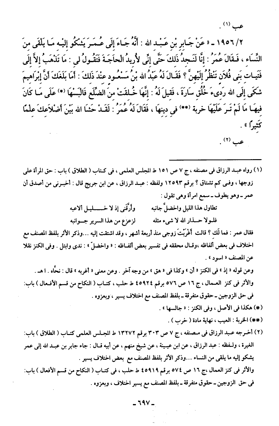 (¬2) أخرجه عبد الرزاق في مصنفه، جـ 7 ص 303 برقم 13272 ط المجلس العلمى كتاب (الطلاق) باب: الغيرة، ولفظه: عبد الرزاق، عن ابن عيينة، عن شيخ منهم، عن أبيه قال: جاء جابر بن عبد اللَّه إلى عمر يشكو إليه ما يلقى من النساء. . . وذكر الأثر بلفظ المصنف مع بعض اختلاف يسير.