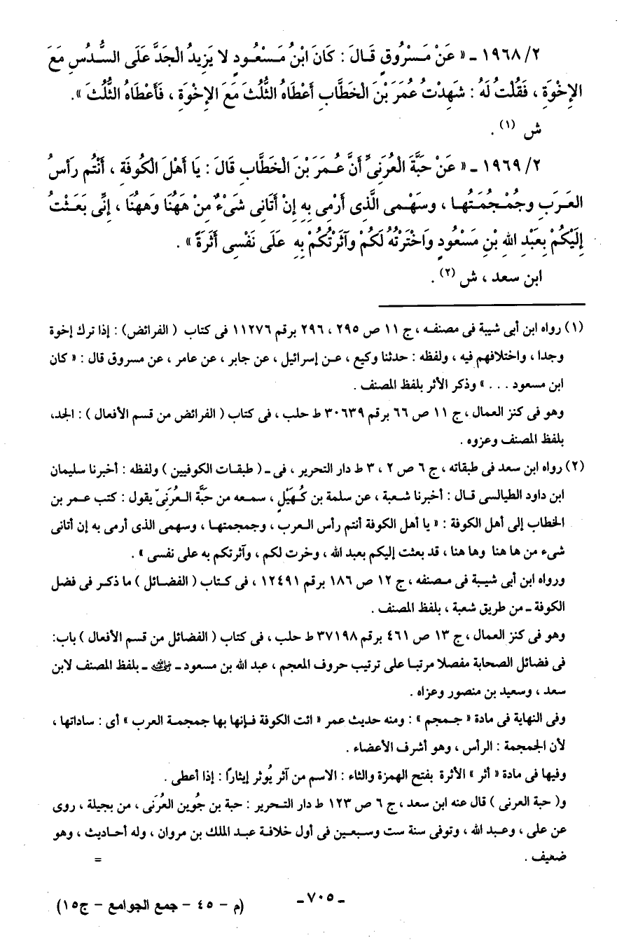 2/ 1968 - "عَنْ مَسْرُوقٍ قَالَ: كَانَ ابْنُ مَسْعُودٍ لا يَزِيدُ الجَدَّ عَلَى السُّدُسِ مَعَ الإِخْوَةِ، فَقُلْتُ لَهُ: شَهِدْتُ عُمَرَ بْنَ الخَطَّابِ أَعْطَاهُ الثُّلُثَ مَعَ الإِخْوَةِ، فَأَعْطَاهُ الثُّلُثَ".