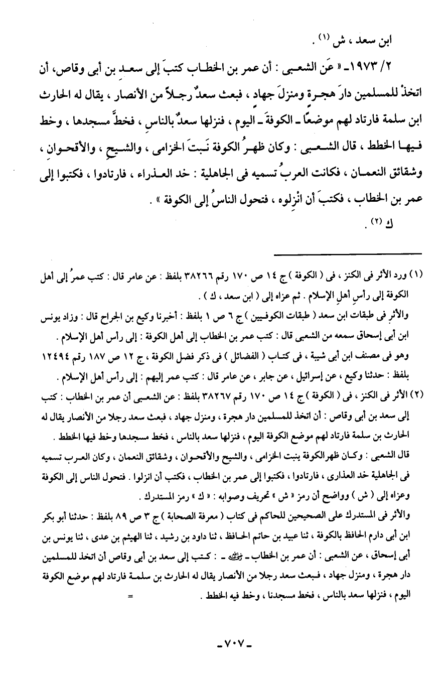 (¬2) الأثر في الكنز، في (الكوفة) جـ 14 ص 170 رقم 38267 بلفظ: عن الشعبى أن عمر بن الخطاب: كتب إلى سعد بن أَبى وقاص: أن اتخذ للمسلمين دار هجرة، ومنزل جهاد، فبعث سعد رجلا من الأنصار يقال له الحارث بن سلمة فارتاد لهم موضع الكوفة اليوم، فنزلها سعد بالناس، فخط مسجدها وخط فيها الخطط.
