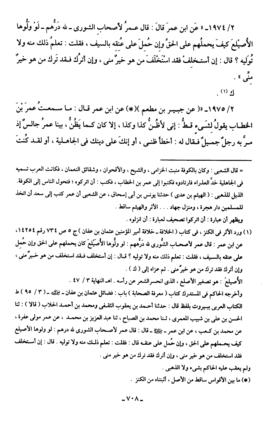(¬1) ورد الأثر في الكنز، في كتاب (الخلافة - خلافة أمير المؤمنين عثمان بن عفان) جـ 5 ص 734 رقم 14254، عن ابن عمر: قال عمر لأصحاب الشورى للَّه دَرُّههم: لو ولُّوها الأُصَيْلعَ كان يحملهم على الحق وإن حُمِل على عنقه بالسيف، فقلت: تعلم ذلك منه ولا توليه؟ قال: إن أستخلف فقد استخلف من هو خَيْرٌ منى، وإن أترك فقد ترك من هو خَيْرٌ منى. ثم عزاه إلى (ك).