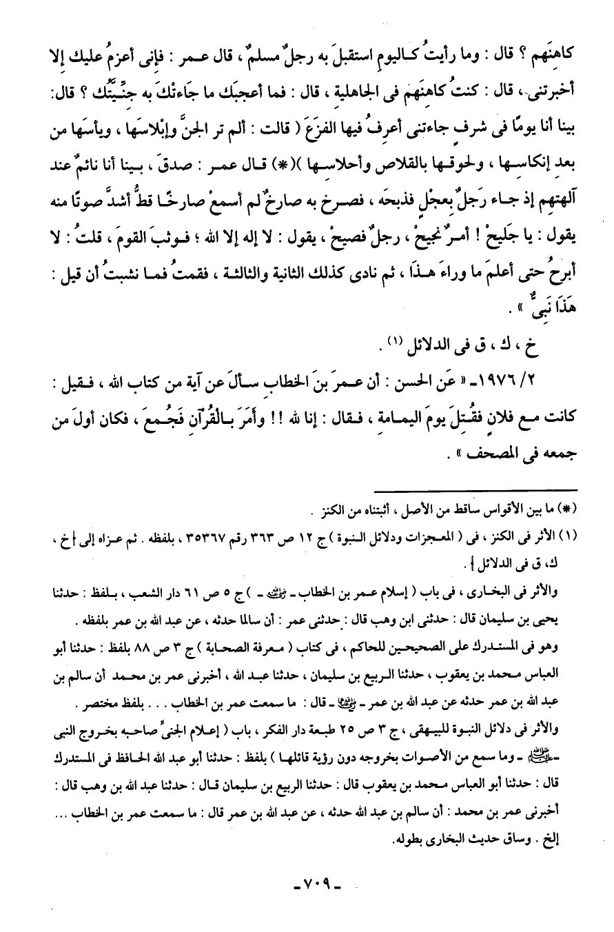 كاهِنَهم؟ قال: وما رأَيتُ كاليومِ استقبلَ به رجلٌ مسلمٌ، قال عمر: فإِنى أعزمُ عليك إِلا أخبرتنى، قال: كُنْتُ كاهِنَهم في الجاهليةِ، قال: فما أعجبَك ما جَاءتْكَ به جِنِّيَّتُك؟ قال: بينا أنا يومًا في شرفٍ جاءتنى أعرِفُ فيها الفزع (قالت: ألم تر الجنَّ وإبلاسَها، ويأسَها من بعدِ إنكاسِها، ولحوقها بالقلاص وأحلاسِها) (*) قال عمر: صدقَ، بينا أنا نائمٌ عند آلهتهِم إذ جاء رَجلٌ بعجْلٍ فذبحَه، فصرخ به صارخٌ لم أسمعْ صارخًا قطُّ أشدَّ صوتًا منه يقول: يا جَليحْ! أمرٌ نجيحْ، رجلٌ فصيحْ، يقول: لا إله إلا اللَّه؛ فوثبَ القومَ، قلتُ: لا أبرحُ حتى أعلمَ ما وراءَ هَذَا، ثم نادى كذلك الثانية والثالثة، فقمتُ فما نشبتُ أن قيل: هَذَا نَبِىٌّ".