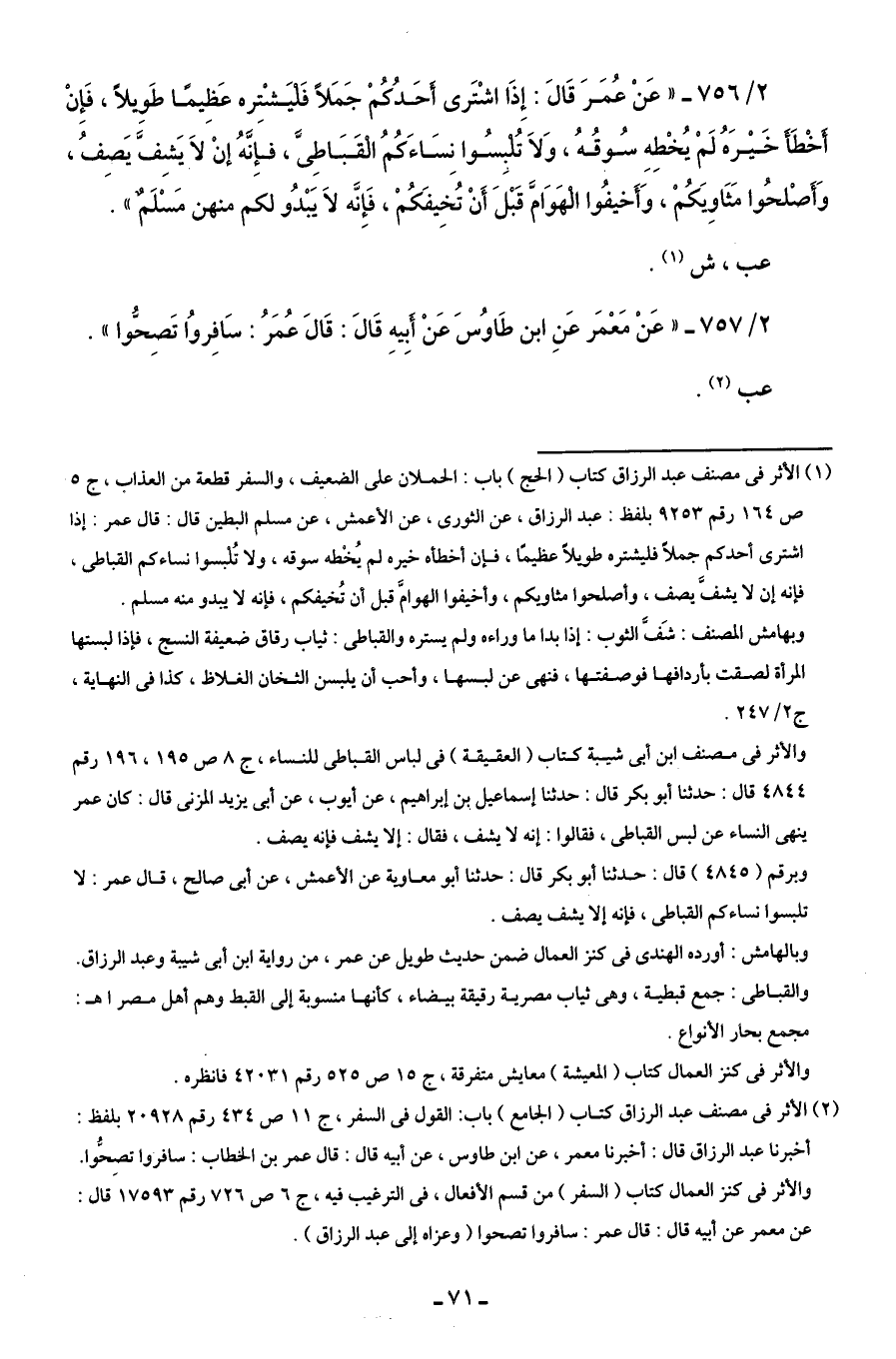 (¬1) الأثر في مصنف عبد الرزاق كتاب (الحج) باب: الحملان على الضعيف، والسفر قطعة من العذاب، ج 5 ص 164 رقم 9253 بلفظ: عبد الرزاق، عن الثورى، عن الأعمش، عن مسلم البطين قال: قال عمر: إذا اشترى أحدكم جملًا فليشتره طويلًا عظيمًا، فإن أخطأه خيره لم يُخْطه سوقه، ولا تُلْبسوا نساءكم القباطى، فإنه إن لا يشفَّ يصف، وأصلحوا مثاويكم، وأخيفوا الهوامَّ قبل أن تُخيفكم، فإنه لا يبدو منه مسلم.