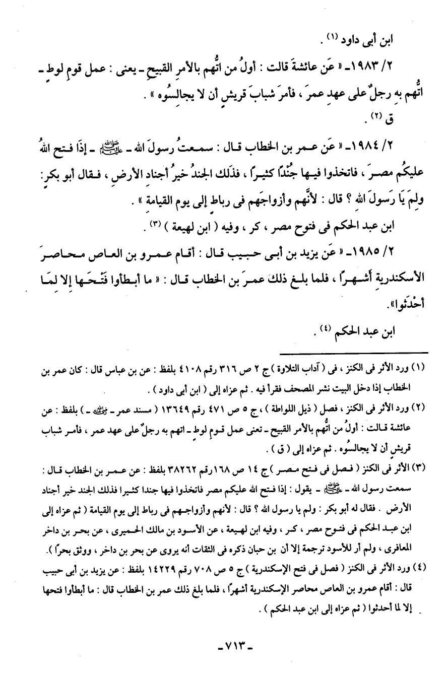 (¬4) ورد الأثر في الكنز (فصل في فتح الإسكندرية) جـ 5 ص 708 رقم 14229 بلفظ: عن يزيد بن أَبى حبيب قال: أقام عمرو بن العاص محاصر الإسكندربة أشهرًا، فلما بلغ ذلك عمر بن الخطاب قال: ما أبطأوا فتحها إلا لما أحدثوا (ثم عزاه إلى ابن عبد الحكم).