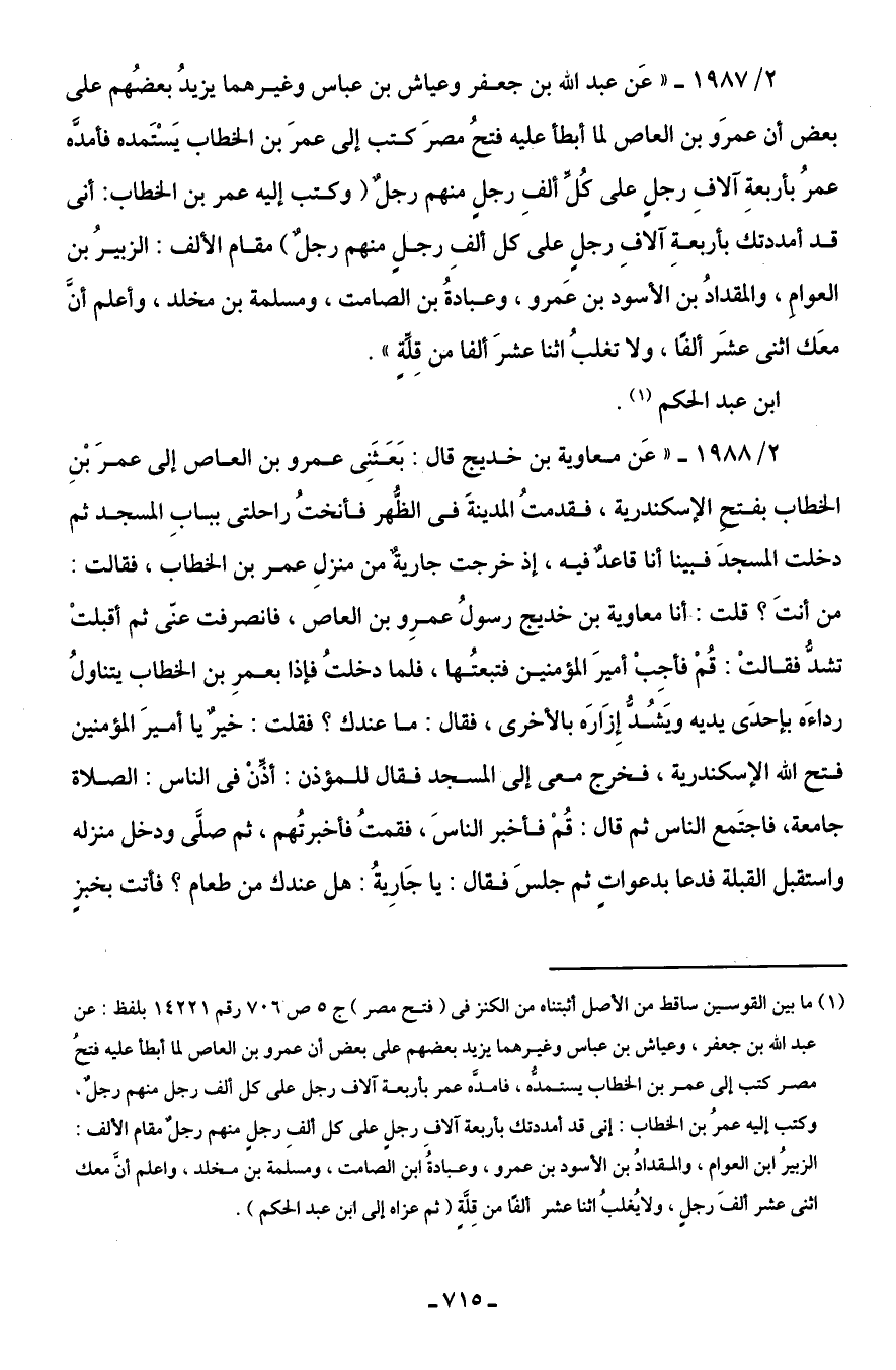 2/ 1987 - "عَن عبد اللَّه بن جعفر وعياش بن عباس وغيرهما يزيدُ بعضُهم على بعض أن عمرَو بن العاص لما أبطأ عليه فتحُ مصرَ كتب إلى عمرَ بن الخطاب يَسْتَمده فأمدَّه عمرُ بأربعةِ آلافِ رجلٍ على كُلِّ ألفِ رجلٍ منهم رجلٌ (وكتب إليه عمر بن الخطاب: أنى قد أمددتك بأربعةِ آلافِ رجلٍ على كل ألفِ رجلٍ منهم رجلٌ) مقام الألف: الزبيرُ بن العوام، والمقدادُ بن الأسود بن عَمرو، وعبادةُ بن الصامت، ومسلمة بن مخلد، وأعلم أَنَّ معَك اثنى عشَر ألفًا، ولا تغلبُ اثنا عشرَ ألفا من قِلّةٍ".