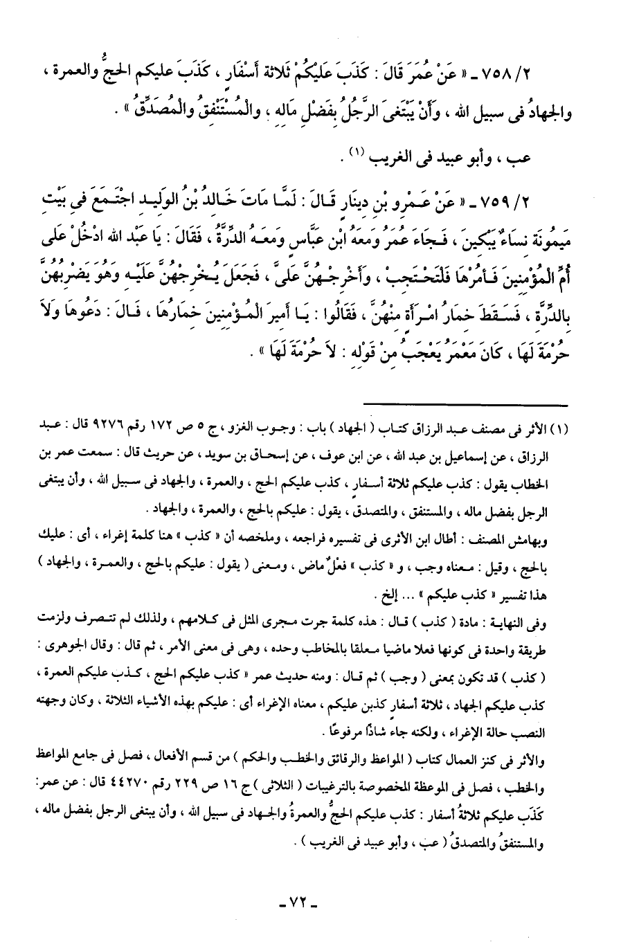 (¬1) الأثر في مصنف عبد الرزاق كتاب (الجهاد) باب: وجوب الغزو، ج 5 ص 172 رقم 9276 قال: عبد الرزاق، عن إسماعيل بن عبد الله، عن ابن عوف، عن إسحاق بن سويد، عن حريث قال: سمعت عمر بن الخطاب يقول: كذب عليكم ثلاثة أسفارٍ، كذب عليكم الحج، والعمرة، والجهاد في سبيل الله، وأن يبتغى الرجل بفضل ماله، والمستنفق، والمتصدق، يقول: عليكم بالحج، والعمرة، والجهاد.
