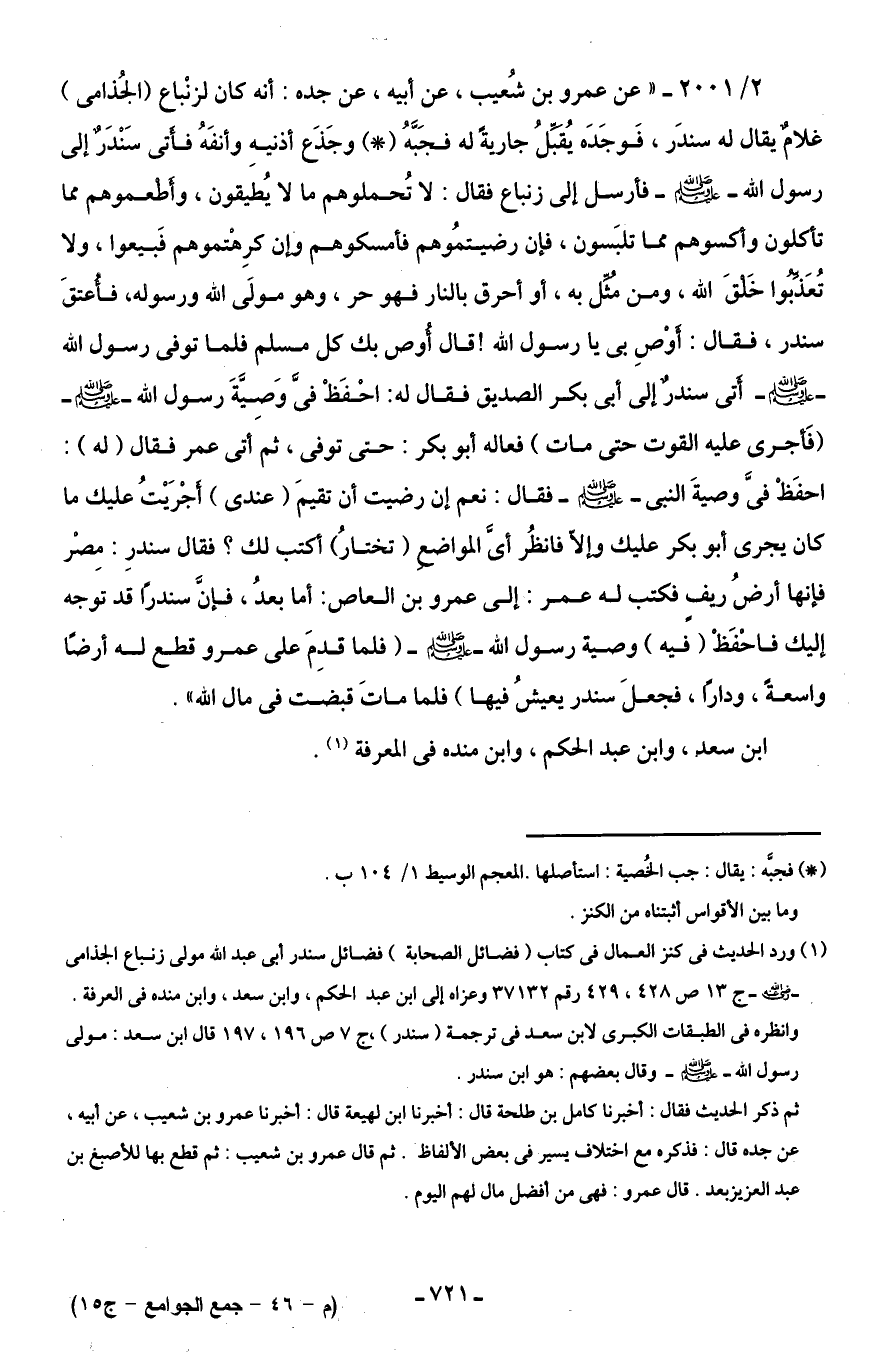 2/ 2001 - "عن عمرو بن شُعيب، عن أبيه، عن جده: أنه كان لزنْباع (الجُذامى) غلامٌ يقال له سندَر، فَوجَدَه يُقبِّلُ جاريةً له فجَبَّهُ (*) وجَذعَ أذنيهِ وأنفَهُ فأتى سَنْدَرٌ إلى رسول اللَّه -صلى اللَّه عليه وسلم- فأرسل إلى زنباع فقال: لا تُحملوهم ما لا يُطيقون، وأطعموهم مما تأكلون وأكسوهم مما تلبَسون، فإن رضيتمُوهم فأمسكوهم وإن كرِهتموهم فَبيعوا، ولا تُعَذِّبوا خَلقَ اللَّه، ومن مُثِّل به، أو أحرق بالنار فهو حر، وهو مولَى اللَّه ورسوله، فأعتقَ سندر، فقال: أوْصِ بى يا رسول اللَّه! قال أُوص بك كل مسلم فلما توفى رسول اللَّه -صلى اللَّه عليه وسلم- أتى سندرٌ إلى أَبى بكر الصديق فقال له: احْفَظْ فىَّ وَصِيَّةَ رسول اللَّه -صلى اللَّه عليه وسلم- (فَأجرى عليه القوت حتى مات) فعاله أبو بكر: حتى توفى، ثم أتى عمر فقال (له): احفَظْ فىَّ وصيةَ النبى -صلى اللَّه عليه وسلم- فقال: نعم إن رضيت أن تقيمَ (عندى) أجْرَيْتُ عليك ما كان يجرى أبو بكر عليك وإلَّا فانظُر أىَّ المواضع (تختارُ) أكتب لك؟ فقال سندرِ: مِصْر فإنها أرضُ ريفٍ فكتب له عمر: إلى عمرو بن العاص: أما بعدُ، فإنَّ سندرًا قد توجه إليك فاحْفَظْ (فيه) وصية رسول اللَّه -صلى اللَّه عليه وسلم- (فلما قدِمَ على عمرو قطع له أرضًا واسعةً، ودارًا، فجعلَ سندر يعيشُ فيها) فلما ماتَ قبضت في مال اللَّه".