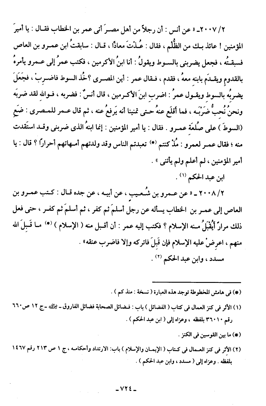 (¬2) الأثر في كنز العمال في كتاب (الإيمان والإسلام) باب: الارتداد وأحكامه، جـ 1 ص 213 رقم 1467 بلفظه. وعزاه إلى (مسدد، وابن عبد الحكم).