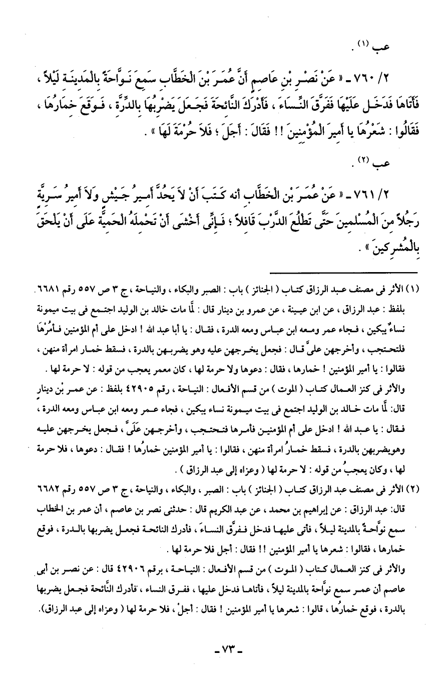 (¬2) الأثر في مصنف عبد الرزاق كتاب (الجنائز) باب: الصبر، والبكاء، والنياحة، ج 3 ص 557 رقم 6682 قال: عبد الرزاق: عن إبراهيم بن محمد، عن عبد الكريم قال: حدثنى نصر بن عاصم، أن عمر بن الخطاب سمع نوَّاحةً بالمدينة ليلًا، فأتى عليها فدخل ففرَّق النساءَ، فأدرك النائحة فجعل يضربها بالدرة، فوقع خمارها، فقالوا: شعرها يا أمير المؤمنين! ! فقال: أجل فلا حرمة لها.