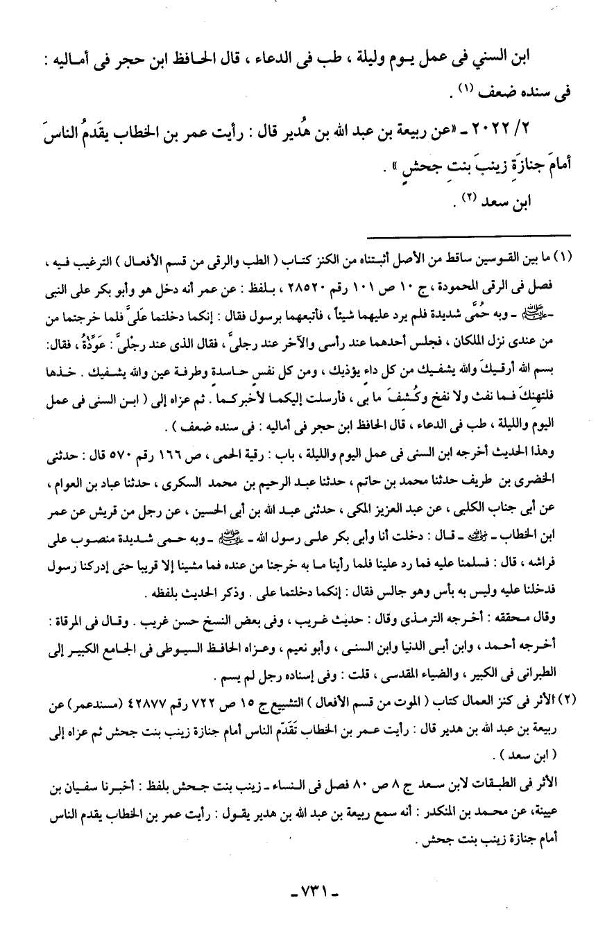2/ 2022 - "عن ربيعة بن عبد اللَّه بن هُدير قال: رأيت عمر بن الخطاب يقَدمُ الناسَ أمامَ جنازَةِ زينبَ بنتِ جحشٍ".