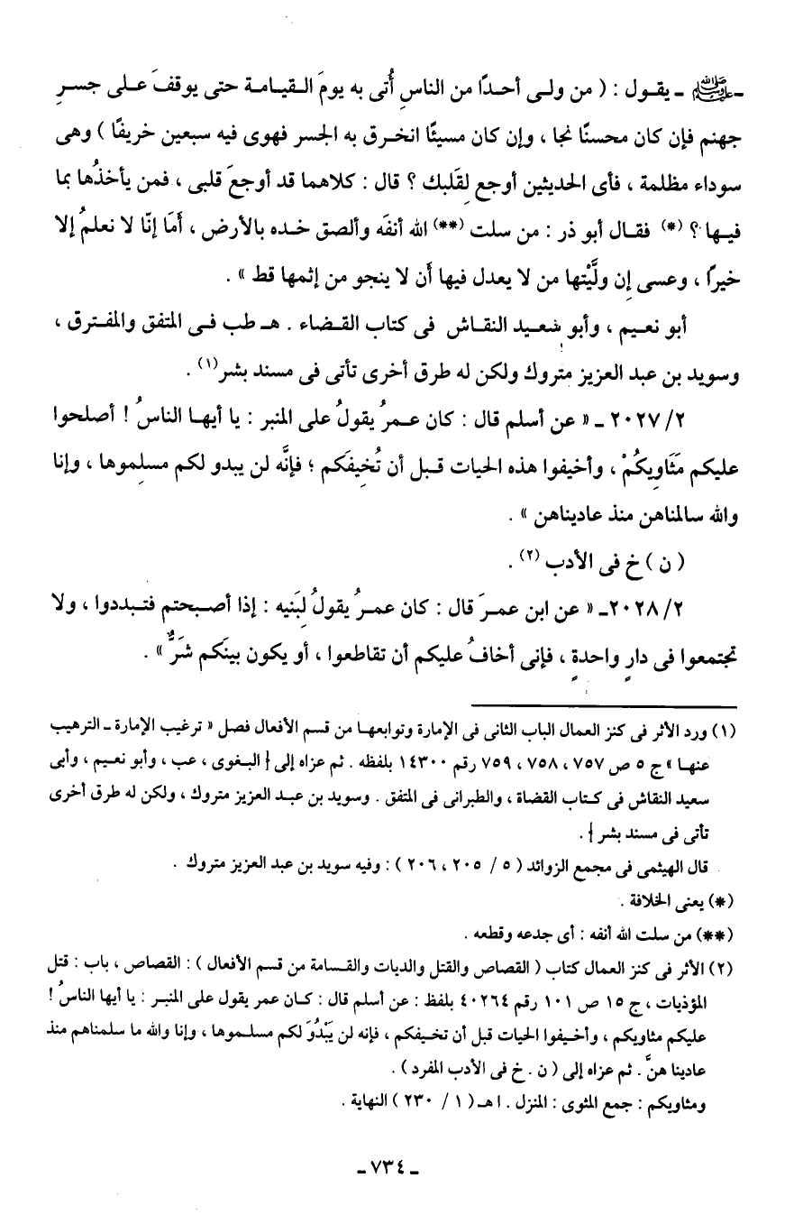 2/ 2027 - "عن أسلم قال: كان عمرُ يقولُ على المنبر: يا أيها الناسُ! أصلحوا عليكم مَثَاوِيكُمْ، وأخيفوا هذه الحيات قبل أن تُخِيفَكم، فإنَّه لن يبدو لكم مسلِموها، وإنا واللَّه ما سلمناهن منذ عاديناهن".